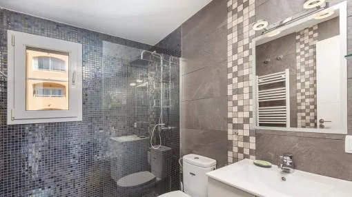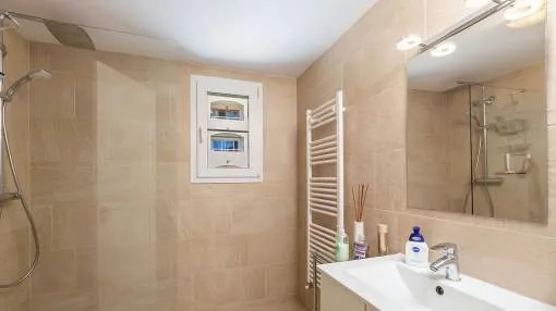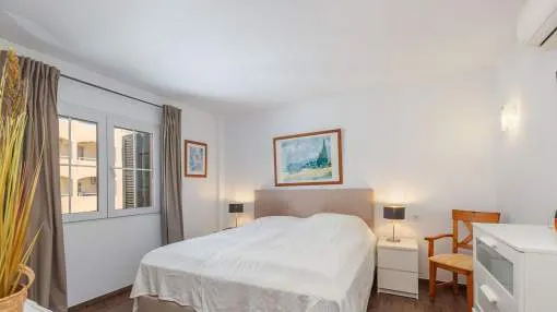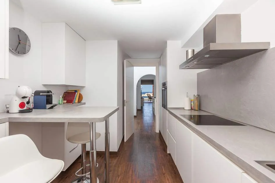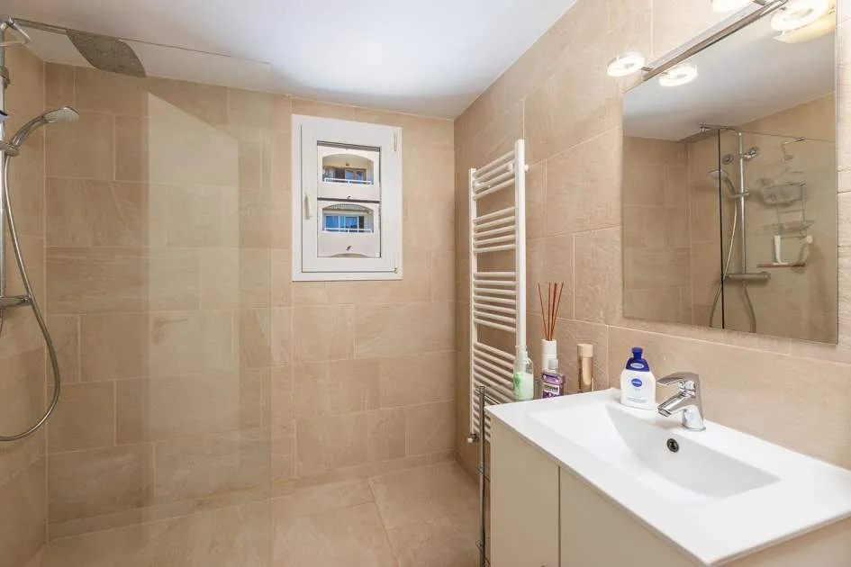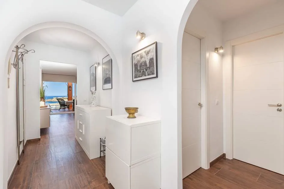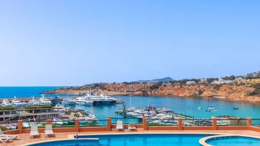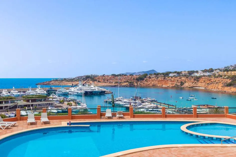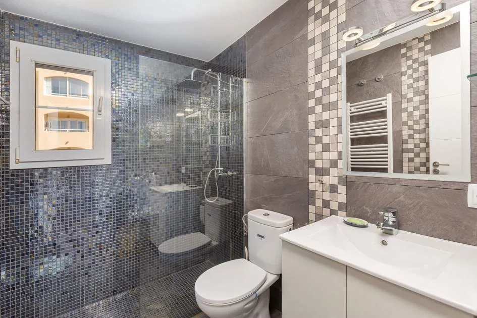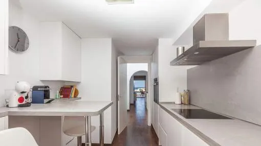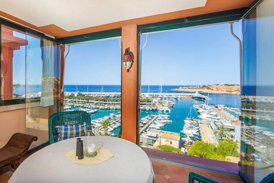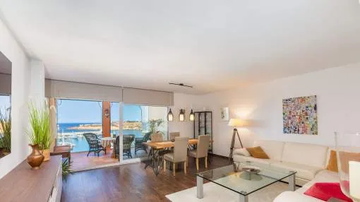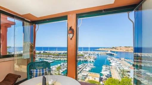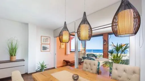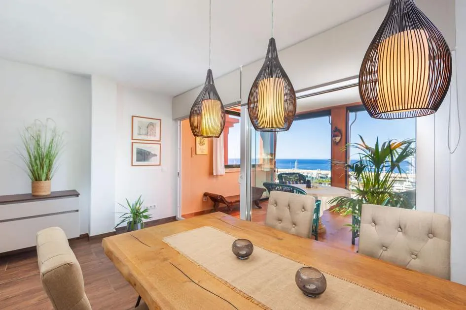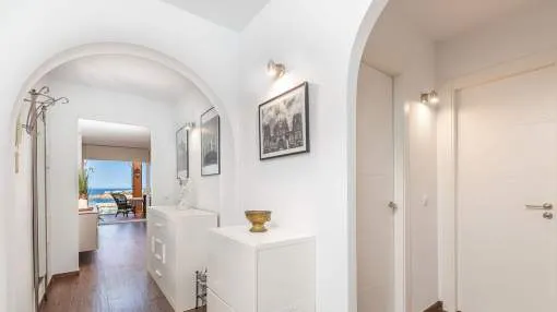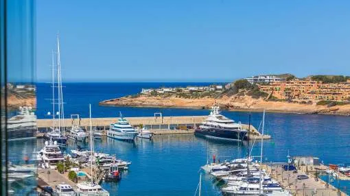 Dieses exklusive Penthaus liegt in der obersten Etage einer gepflegten, mediterranen Anlage in El Toro in erster Meereslinie, oberhalb von Port Adriano mit seinen luxuriösen Restaurants und Designer-Boutiquen. Der Sandstrand, Geschäfte und Cafés sind fußläufig erreichbar und auch die Golfplätze sowie Santa Ponsa sind nur wenige Minuten entfernt. Die Anlage verfügt über einen schönen Garten, eine Sonnenterrasse und einen Pool, der einen atemberaubenden Meerblick bietet. Das modern renovierte Penthaus verfügt über Fußbodenheizung, Klimaanlage und eine voll ausgestattete Miele-Küche. Der großzügige Wohn-Essbereich öffnet sich zu einer 15 m² großen, überdachten Terrasse mit vollständiger Verglasung. Sie ist ganzjährig nutzbar und bietet einen herrlichen Panoramablick über Hafen und Meer. Die flexibel zu öffnenden Glaselemente und die Südwest-Ausrichtung garantieren viel Sonne und ein helles Ambiente. Im Mietpreis inkludiert ist ein PKW-Stellplatz und geräumiger Kellerraum in der Tiefgarage.