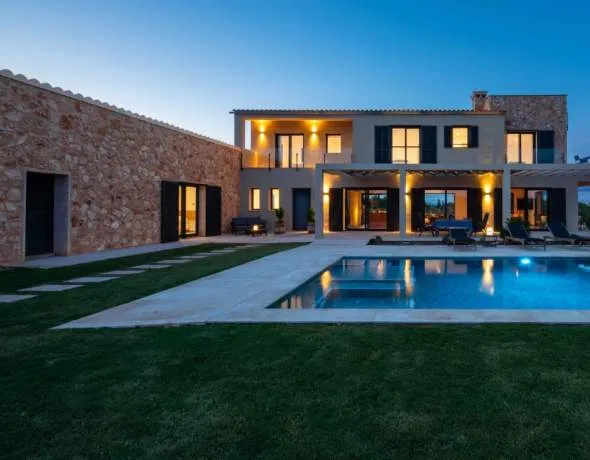 Am Ortsrand von Ses Salines, nur etwa 600 Meter vom Ortszentrum entfernt, befindet sich diese wundervolle Finca auf einem ca. 14.100 m² großen Grundstück. Die im Jahr 2020 fertiggestellte Immobilie fügt sich harmonisch in die mediterrane Umgebung ein.