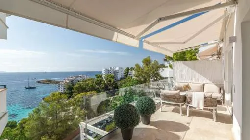 Diese moderne Meerblickvilla liegt oberhalb des Luxushafens von Puerto Portals. Diese verfügt über insgesamt 5 Schlafzimmer und 5 Badezimmer ensuite und einem begehbaren Ankleideraum und privatem Patio im Hauptschlafzimmer. Die Aufteilung zieht sich über drei Ebenen. Auf der oberen Etage befinden sich der Haupteingang mit 2 Gästeschlafzimmern und vollausgestatteten en suite Badezimmern. Der Aufzug führt von hier bis in die unterste Etage. Auf der mittleren Ebene befindet sich die Poliform Hauptküche mit großzügigem, lichtdurchflutetem Esszimmer, eines der Wohnzimmer mit Kaminsowie einer Gästetoilette. In der unteren Ebene finden Sie ein weiteres Wohnzimmer mit direktem Zugang zum Infinity Pool und zwei weiteren Gästezimmern mit Badezimmern ensuite. Ein großzügiger Lounge-Bereich am Pool mit einer komplett ausgestatteten Aussenküche runden das mediterrane Ambiente perfekt ab. Von allen Zimmern und den Terrassen haben Sie einen fantastischen Blick auf das Mittlemeer. Zu den Ausstattungsmerkmalen gehören neben Poliform Schränken, einer Poliform Küche, Minotti Mobiliar, Zentraler Klimaanlage und durchgängiger Fussbodenheizung noch vieles mehr. Zusammengefasset; Das perfekte Zuhause auf Mallorca! Costa den Blanes gehört zu einem der exklusivsten Wohngebiete im Südwesten Mallorcas. OBerhalb des Yachthafens Puerto Portals, wunderschöner Sandstrände und internationaler Schulen lässt sich hier das mediterrane Klima ganzjährig in Ruhe genießen. Sowohl die Inselhauptstadt Palma ist nur 15 Minuten und der Flughafen ist in 25 Minuten mit dem Auto zu erreichen.