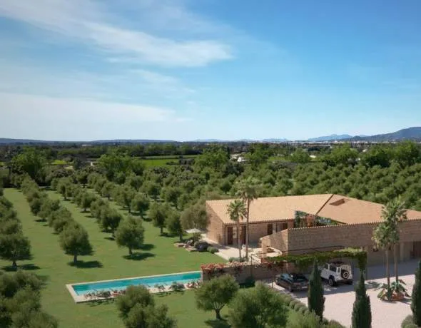 Ein bestehendes landwirtschaftliches Gebäude von 200 m² ist vorhanden, und eine genehmigte Baugenehmigung für ein elegantes neues Landhaus von 300 m² auf einer Ebene mit 100 m² Untergeschoss und Pool liegt vor. Die Architektur verbindet modernen Komfort mit mallorquinischem Charakter und bietet großzügige Wohnbereiche, private Schlafsuiten sowie fließende Übergänge zwischen Innen- und Außenbereichen mit Blick auf die ländliche Umgebung und die Berge.