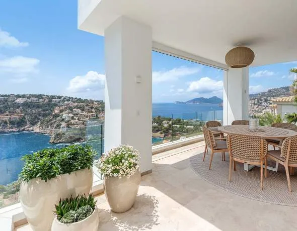 In sehr begehrter Villenwohnlage hoch oberhalb der Cala Marmacén mit Blick auf die Bucht, die Halbinsel La Mola bis zur Insel Dragonera wurde diese moderne Villa mit Lift im Zuge einer umfassenden Renovierung in höchster Ausstattungsqualität fertiggestellt. Das Haus genießt einen herrlichen Meer- und Panoramablick. Der Hauptwohnbereich im Erdgeschoß verfügt über ein lichtes Wohn-/ Esszimmer mit offener Designer-Küche, eine Bodega, eine große Schlafzimmersuite mir Ankleide, ein Schlafzimmer mit Bad en Suite, eine Gästetoilette und eine große überdachte Terrasse. Das Obergeschoss bietet das sehr großzügige Hauptschlafzimmer mit Ankleide, Bad en Suite und Zugang zu einer Meerblick-Terrasse sowie zwei weitere Schlafzimmer mit Ankleide und Bad en Suite. Auf dieser Etage befindet sich auch die Doppelgarage. Des Weiteren stehen im Untergeschoss auf der Poolebene ein Fitnessraum, ein großer Mehrzweckraum sowie ein eine Gäste-Toilette zur Verfügung. Im Außenbereich überzeugt die Villa durch großzügige freie und überdachte Terrassenbereiche mit eingebettetem Salzwasser-Swimmingpool und Lounge-Ecke. Ein Aufzug verbindet bequem alle Ebenen.