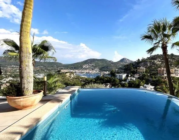 Diese prachtvolle Villa bietet einen wunderbaren Aufenthalt mit beeindruckendem Blick auf das Mittelmeer. Sie befindet sich in einer sehr ruhigen Gegend der Insel, innerhalb einer kleinen und exklusiven Gemeinschaft. Nur 5 Autominuten vom Strand und dem Hafen von Andratx entfernt, der eine hervorragende internationale Gastronomie bietet, verwandelt diese Immobilie Ihren Aufenthalt in ein traumhaftes Erlebnis.