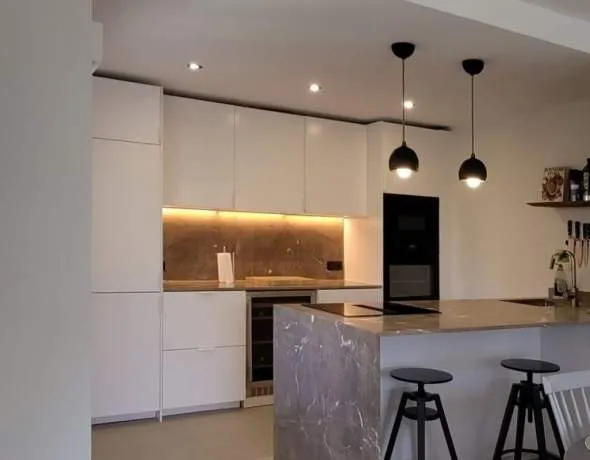 Es verfügt über drei Doppelzimmer, von denen eines ein eigenes Bad hat. Das Herzstück der Wohnung bilden das Wohnzimmer, der Essbereich und eine geräumige, offene Küche mit Kochinsel, die alle auf einen charmanten, nach Südwesten ausgerichteten Balkon führen. Die Wohnung wurde 2024 komplett renoviert, einschließlich der Bäder und der Küche.