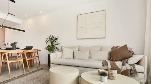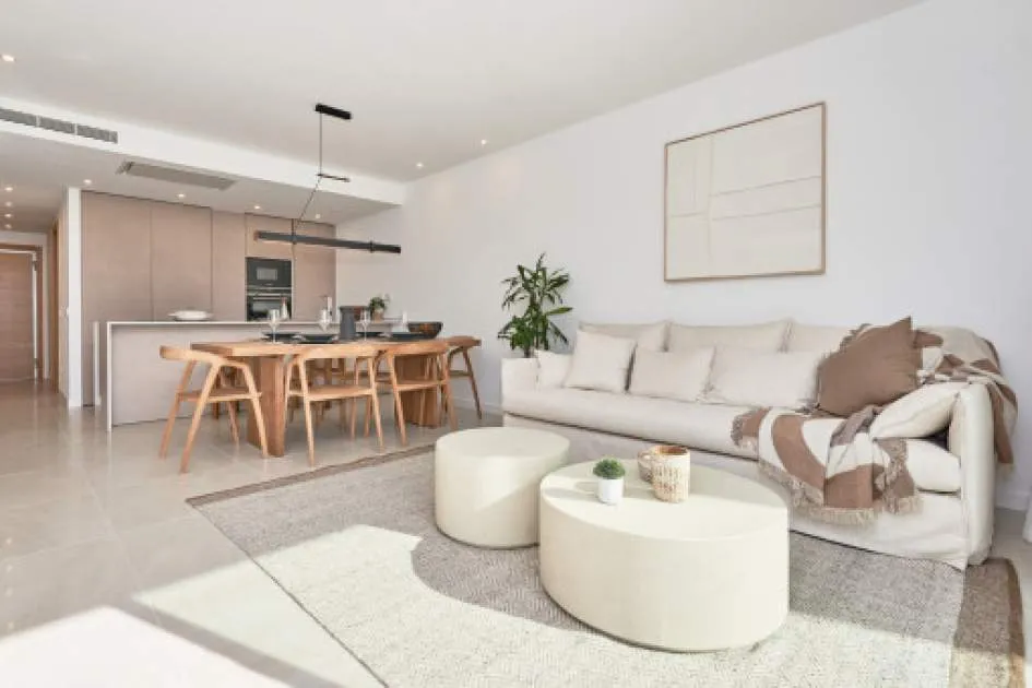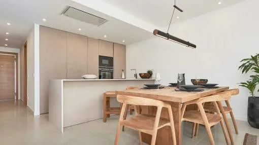 Objektbeschreibung: In traumhafter Lage von Sant Elm, einem der charmantesten Küstenorte im Südwesten Mallorcas, entsteht eine exklusive Wohnanlage mit nur 20 Einheiten – eingebettet in mediterrane Natur, vor der Insel Dragonera gelegen, mit Blick auf das türkisfarbene Meer. Sant Elm begeistert mit Ibiza-Flair, kleinen Restaurants, charmanten Geschäften und einer angenehm beschaulichen Atmosphäre. Hier genießt man das ursprüngliche Mallorca – in einem Ort voller Natürlichkeit und Charakter. Besondere Highlights des Penthouses sind der Meerblick, die fußläufige Strandnähe, die Energieeffizienzklasse A und ein klares, mediterranes Design, das Innen- und Außenraum fließend verbindet. Die Umgebung mit Pinienwäldern und Küstenwegen bietet pure Erholung in der Natur. Die hochwertige Neubauanlage umfasst 8 Penthäuser, 8 Gartenwohnungen und 4 Duplexapartments mit Garten und Dachterrasse. Sie bietet großzügige Außenbereiche, einen stilvollen Gemeinschaftspool, eigene Carports und wird von einem renommierten Bauträger mit viel Liebe zum Detail realisiert. Die Architektur setzt auf Naturtöne, Leichtigkeit und Langlebigkeit – ganz im Stil mediterraner Eleganz. Das hier angebotene Penthouse bietet ca. 95,52 qm konstruierte Innenfläche auf einer Ebene mit drei Schlafzimmern und drei Badezimmern, davon zwei en suite. Der lichtdurchflutete Wohn-/Essbereich mit offener Inselküche öffnet sich zur Terrasse mit 21,72 qm. Ein Highlight ist die zusätzliche Dachterrasse mit 94,74 qm, die atemberaubenden Meerblick über die Bucht von Sant Elm bietet. Ausstattungsdetails:
