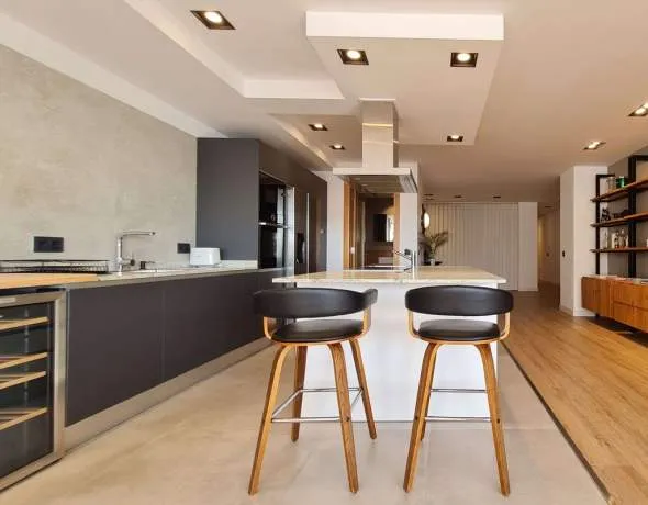 Der Raum ist aufgeteilt in ein Wohn-Esszimmer mit offener Küche, ausgestattet mit hochwertigen Bosch-Geräten, Eismaschine und Wasserenthärter. Es gibt zwei Schlafzimmer mit eigenem Bad und Ankleidezimmer, von denen sich eines vollständig in den Hauptwohnbereich öffnet.