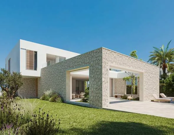 Diese hochwertige Villa ist Teil eines exklusiven Neubauprojekts von Designer-Villen mit geplanter Fertigstellung im Jahr 2027 und vereint moderne Architektur mit natürlichen Materialien und klaren Linien. Die Kombination aus hellen, kubischen Baukörpern und stilvollen Natursteinfassaden verleiht dem Anwesen eine zeitlose, elegante Ausstrahlung.