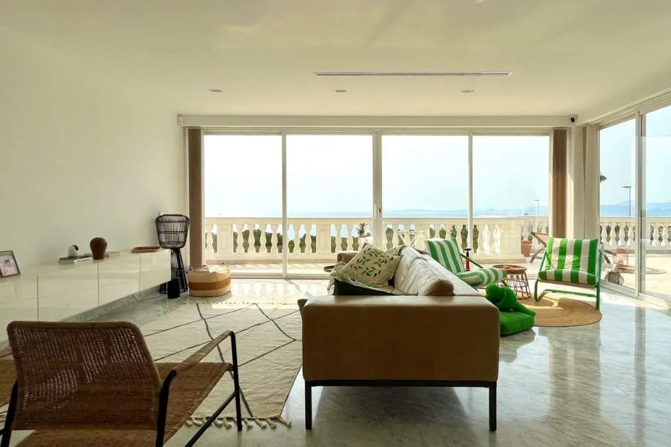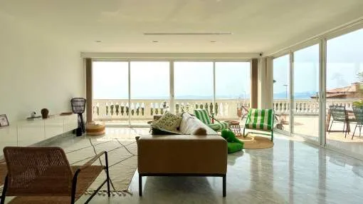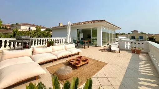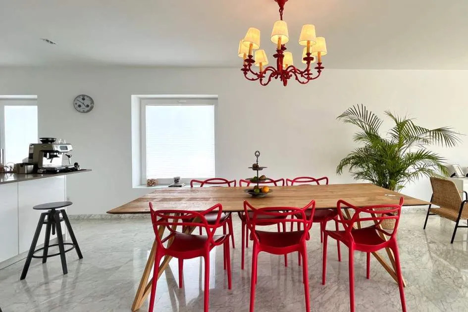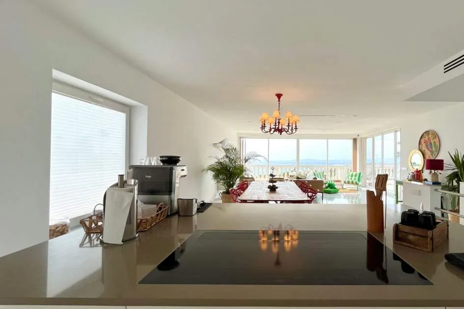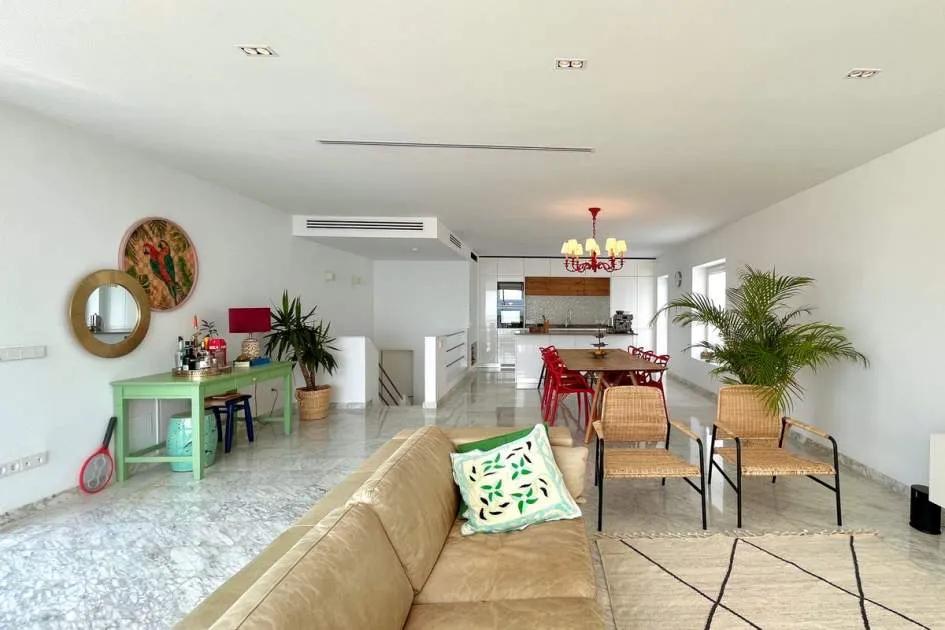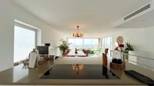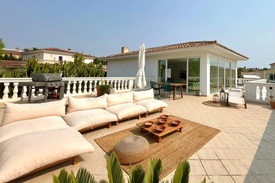 Im Obergeschoss verbindet das helle und geräumige Wohnzimmer zusammen mit der voll ausgestatteten offenen Küche eine große Terrasse mit herrlichem Meerblick und spektakulären Sonnenuntergängen, inklusive Chill-out-Bereich und Grillplatz - ideal zum Entspannen oder für gesellige Runden.