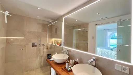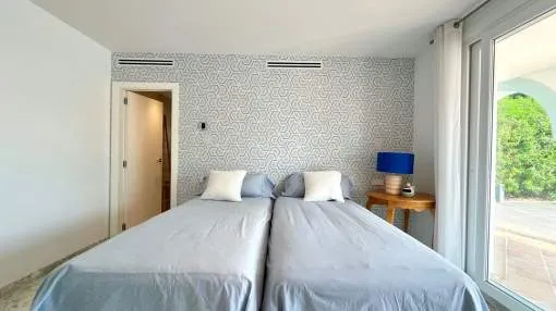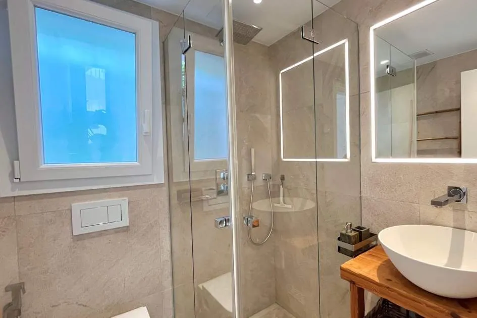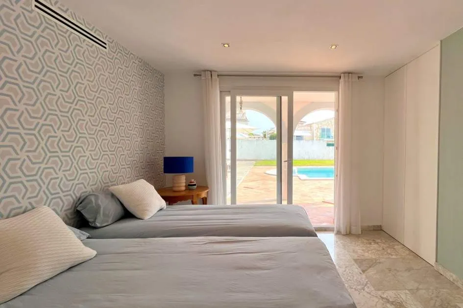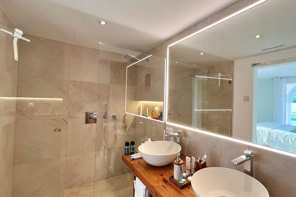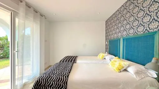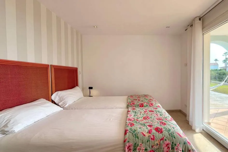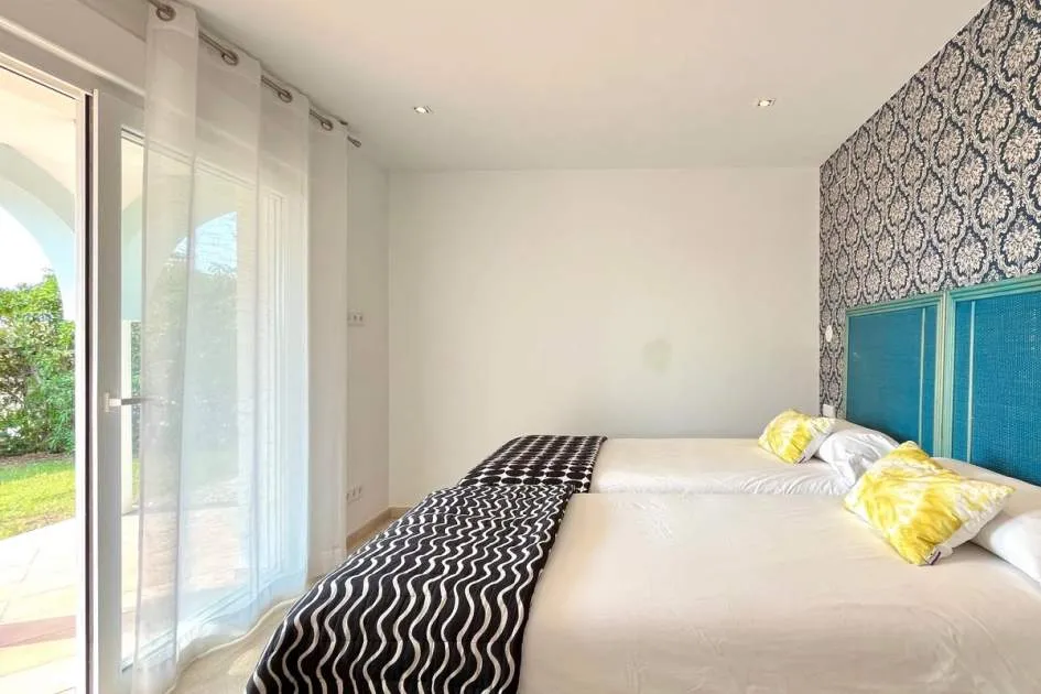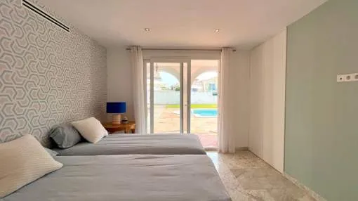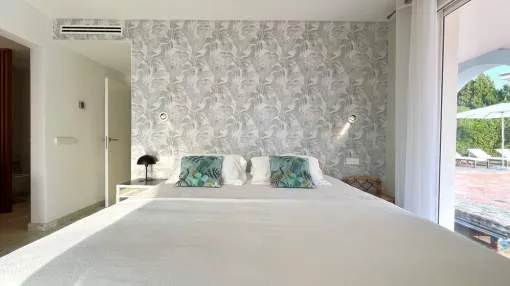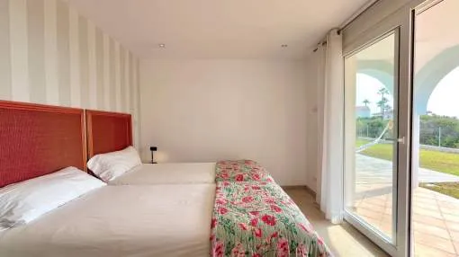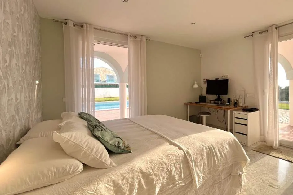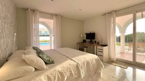 Im Erdgeschoss befinden sich vier Doppelzimmer, jeweils mit eigenem Bad und unabhängigem Zugang zum Pool und Garten. Das Hauptschlafzimmer verfügt über einen begehbaren Kleiderschrank, außerdem gibt es eine Speisekammer und ein Gäste-WC.