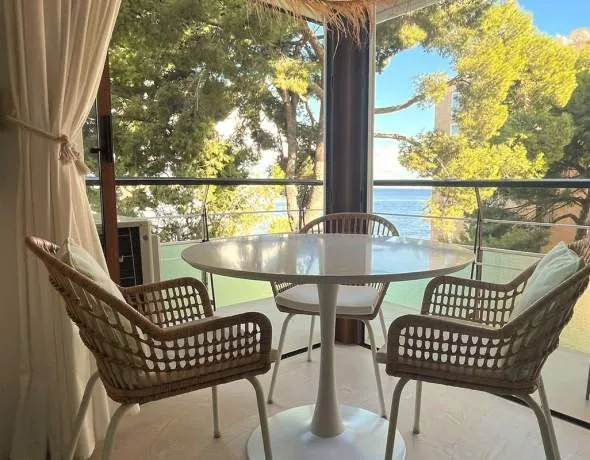 Die Anlage bietet einen 24-Stunden-Conciergeservice, der ein hohes Maß an Sicherheit und Ruhe gewährleistet, sowie direkten Zugang zum Meer, einen Swimmingpool und gepflegte Gemeinschaftsbereiche. Die Wohnung ist mit hochwertigen Möbeln eingerichtet und verfügt über eine moderne, voll ausgestattete Küche, die maximalen Komfort und Stil bietet.