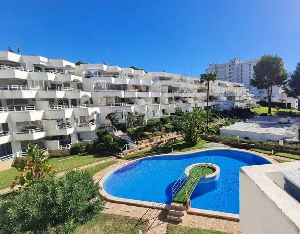 Die 18 m² große Terrasse in Südausrichtung eröffnet einen herrlichen Blick auf die gepflegte Gemeinschaftsanlage mit Pool und teilweise auf die malerische Bucht von Cala Vinyes – ein perfekter Ort, um Sonnenauf- und -untergänge zu genießen, ein Frühstück im Freien zu genießen oder abends den Tag bei einem Glas Wein ausklingen zu lassen.
