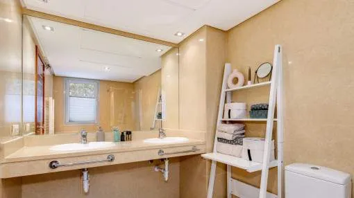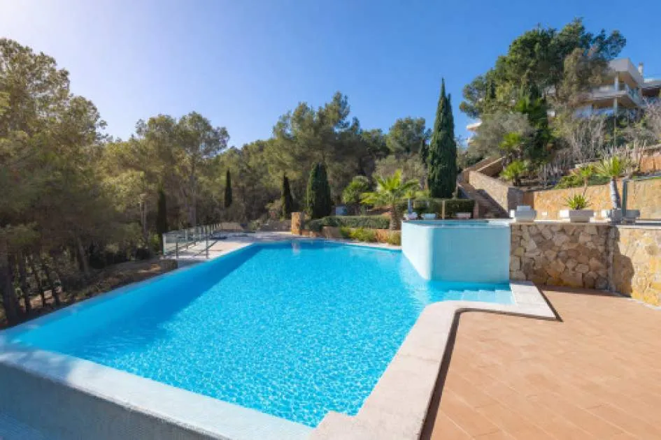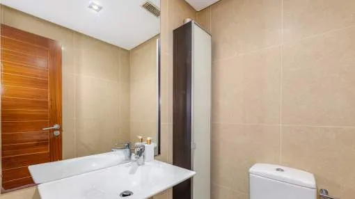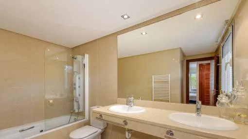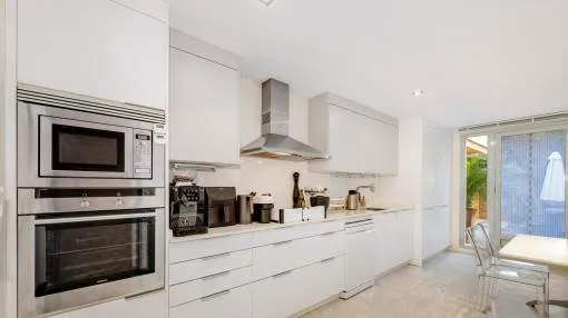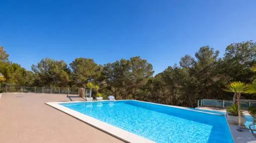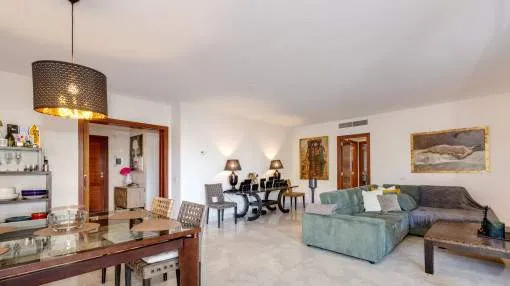 Objektbeschreibung: Diese hochwertige Erdgeschosswohnung befindet sich in Sol de Mallorca, einer begehrten Wohngegend unweit der idyllischen Badebuchten Caló de sa Nostra Dona und Cala de Portals Vells. Sie liegt in einer gepflegten Wohnanlage, die über einen Gemeinschaftspool und einen Padelplatz verfügt, und bietet eine gelungene Kombination aus Komfort, Privatsphäre und moderner Ausstattung. Mit einer Wohnfläche von ca. 190 qm, einer großzügigen Terrasse von 53 qm sowie einem privaten Garten der 415 qm groß ist, bietet die Wohnung ein ideales Wohnkonzept. Hochwertige Materialien und eine elegante Gestaltung unterstreichen den exklusiven Charakter der Immobilie. Vom Eingangsbereich aus gelangt man in die moderne Küche, die direkten Zugang zur hinteren Terrasse und zum Garten bietet. Dort befindet sich zudem ein praktischer Abstellraum für Gartenutensilien. Das großzügige und helle Wohn- und Esszimmer ist mit großen Schiebetüren ausgestattet, die den direkten Zugang zur sonnigen Terrasse und zum Garten ermöglichen. Das Hauptschlafzimmer verfügt über ein Badezimmer en Suite und große Kleiderschränke. Sowohl dieses als auch ein weiteres Schlafzimmer bieten direkten Zugang zur Terrasse. Darüber hinaus gibt es zwei weitere geräumige Schlafzimmer sowie zwei Badezimmer mit Dusche. Ein zusätzliches Gäste-WC rundet die gelungene Raumaufteilung ab. Die Wohnung besticht durch edle Marmorfußböden sowie Marmorfliesen in den Badezimmern. Die Fenster sind doppelt verglast und mit Aluminiumrahmen der Marke Tecnal ausgestattet. Zudem verfügt die Immobilie über Rollläden, eine effiziente Gaszentralheizung sowie eine Klimaanlage für warme und kalte Temperaturen. Zur Wohnung gehören außerdem zwei Parkplätze und ein Abstellraum im Keller mit einer Größe von 20 qm. Diese Immobilie bietet erstklassige Wohnqualität in exklusiver Lage und eignet sich ideal für anspruchsvolle Käufer, die Komfort, Eleganz und ein mediterranes Lebensgefühl schätzen. Lage & Umgebung: Sol de Mallorca liegt inmitten von Pinienwäldern, verfügt über hübsche Badebuchten, ruhige Spazierwege und einem kleinen (Mini-) Hafen. Nach "Portals Vells", genannt "Dreifingerbucht", kommen in erster Linie die Boote aus den umliegenden Sporthäfen und Besucher aus der Region um Magaluf und Palmanova. Die Hauptbucht "Sa Platgeta" lädt zum Essen auf der schattigen Terrasse des Restaurants ein und "Cala Magó" wurde nicht nur wegen ihrer Schönheit berühmt, sondern es handelt sich bei dem Ministrand von 28 m Länge und 29 m Breite um den ersten offiziellen Nudistenstrand der Gemeinde Calvia. Ebenfalls zu empfehlen sind die Nebenbuchten "Bella Donna" mit besonders hellem Sand und die "Cala Falcó" mit Restaurant, Musik und Drinks, die bei jungen Leuten sehr beliebt ist. Die Nähe zu den Golfplätzen Poniente und Santa Ponsa, wie auch zu den Yachthäfen Port Adriano und Puerto Portals, sowie die gute Anbindung an die Autobahn machen diesen Standort interessant.