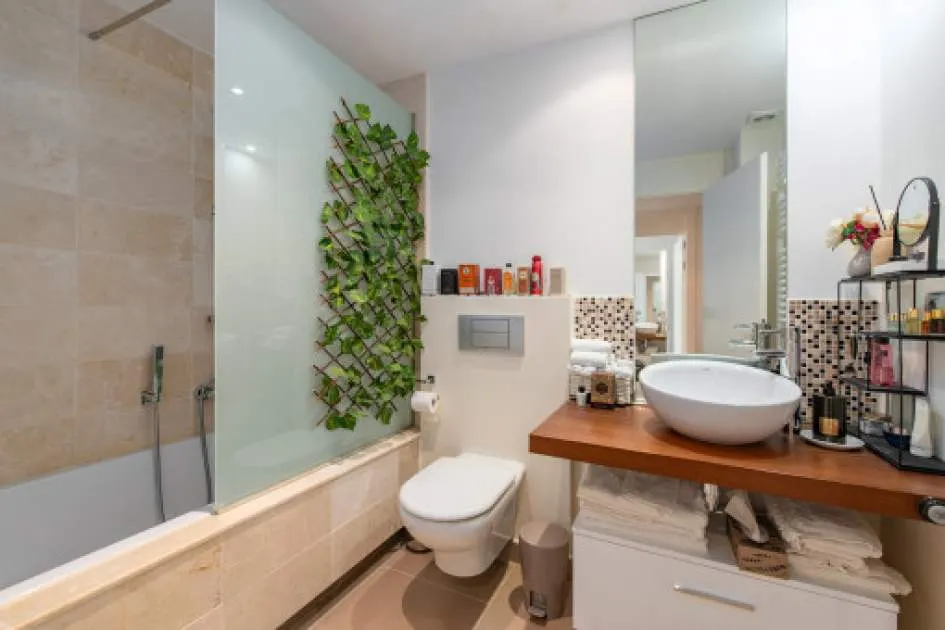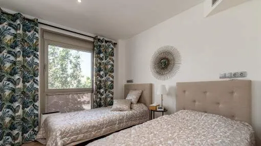 Der offen gestaltete Wohn- und Essbereich vermittelt ein helles, luftiges Wohngefühl und bietet direkten Zugang zur Terrasse. Die separate Küche ist vollständig ausgestattet. Zwei komfortable Schlafzimmer sowie 2 moderne Badezimmer, eines davon en Suite, bieten ausreichend Platz und Privatsphäre. Eine Klimaanlage und Infrarotheizung sorgt in allen Räumen für angenehmes Raumklima zu jeder Jahreszeit. Ausserdem verfügt die Wohnung über eine Osmoseanlage zur Trinkwassererzeugung sowie einen Tiefgaragenstellplatz und Kellerraum.