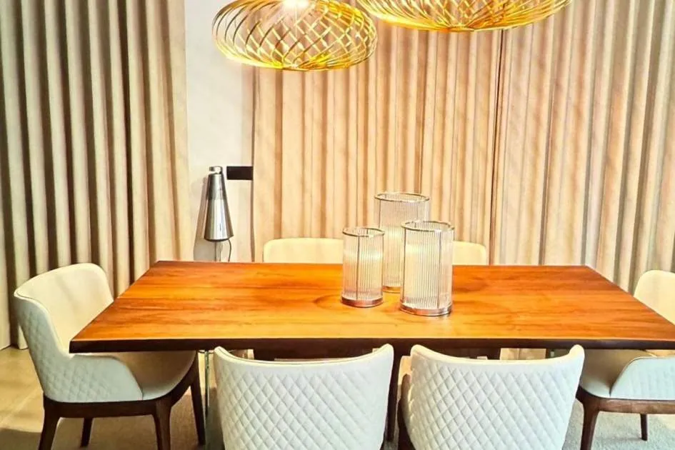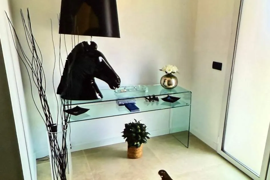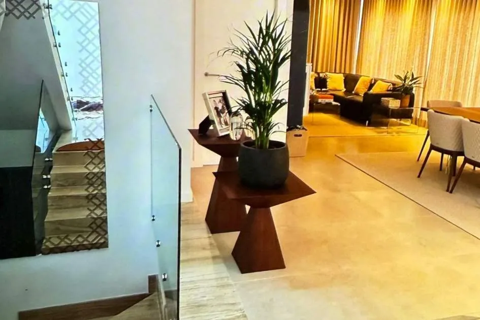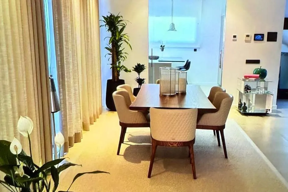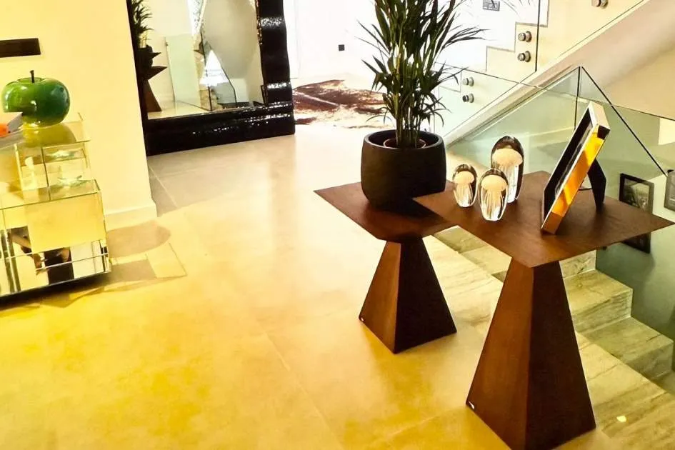 Erdgeschoss: Offenes, halboffenes Raumkonzept mit Wohn-Essbereich und Kamin, Designerküche komplett ausgestattet mit hochwertigen Geräten, ein Schlafzimmer und ein Badezimmer. Direkter Zugang zum Garten und zum Poolbereich.