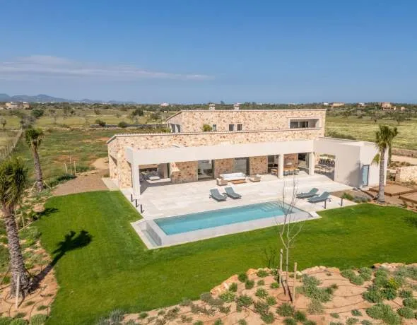 In ruhiger Lage nahe Santanyí befindet sich diese exklusive Neubaufinca, die moderne Architektur, mediterranen Charakter und hochwertige Bauqualität harmonisch vereint. Die stilvolle Natursteinfassade verleiht der Immobilie einen authentischen Finca-Charakter und fügt sie perfekt in die umliegende Landschaft ein.