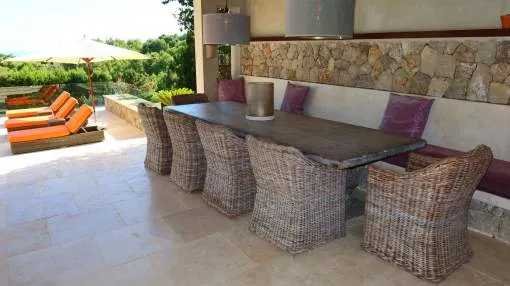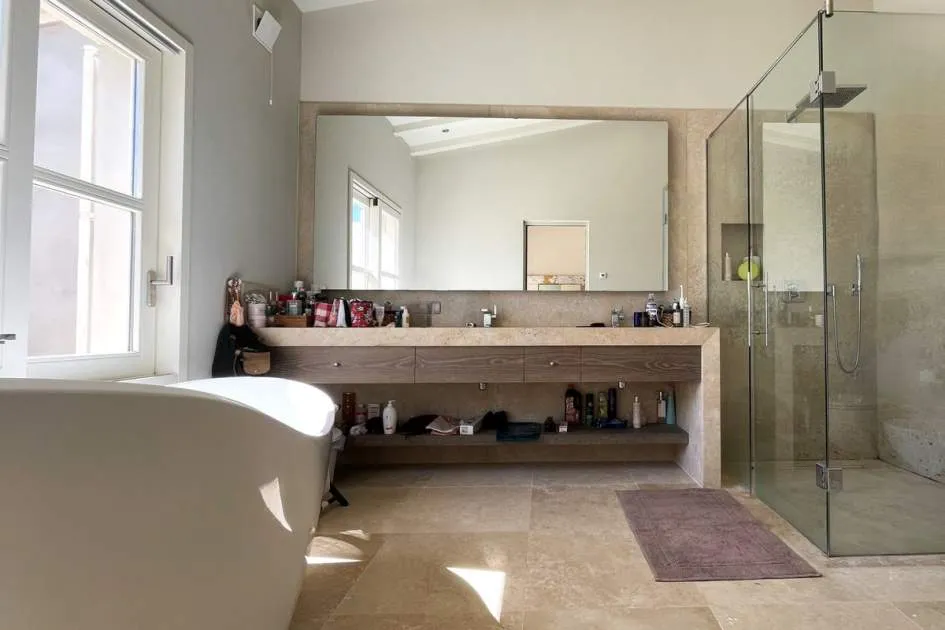 Die Innenräume beeindrucken mit hohen Decken, Fußbodenheizung, Klimaanlage und einem gemütlichen Kamin, sodass zu jeder Jahreszeit eine behagliche Atmosphäre entsteht. Auf der sonnenverwöhnten Terrasse genießen Sie absolute Privatsphäre, einen funkelnden Salzwasserpool und einen einladenden BBQ-Bereich für entspannte Abende im Freien.