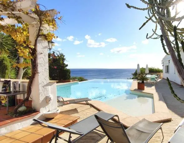 Beeindruckende Immobilie direkt am Meer mit spektakulären 200º-Blicken über das Mittelmeer und einem traumhaften Infinity-Pool, der scheinbar im Horizont verschmilzt. Das Haus ist vollständig ausgestattet, teilweise renoviert und mit zentraler Gasheizung versehen, was das ganze Jahr über ein komfortables und anspruchsvolles Ambiente schafft.