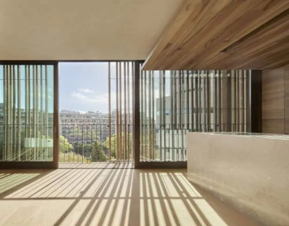 Die Fassaden sind mit festen und beweglichen Naturholzpaneelen verkleidet. Das Qualitätsniveau ist sehr hoch, und es wurden nur natürliche Materialien verwendet, um den Wohnungen Wärme und einen mediterranen Touch zu verleihen, wie z. B. massive Türen aus französischem Nussbaum, Schränke aus Zedernholz, ausgewählte Eiche, traditioneller Kalkputz an Wänden und Decken, massive Waschbecken aus lokalem Stein oder antike Bronzestücke, die die Innenräume der Wohnungen prägen.
