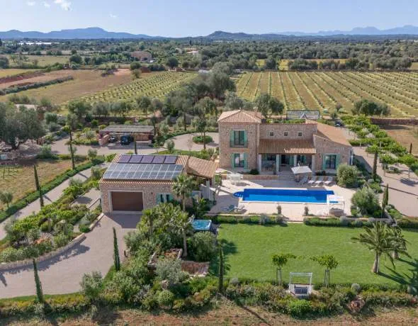 In privilegierter, ruhiger Lage zwischen Felanitx und Porreres liegt dieses außergewöhnliche Anwesen, das luxuriöses Wohnen mit mallorquinischer Natur und hoher Privatsphäre verbindet. Das rund 70.000 m² große Grundstück umfasst einen eigenen Olivenhain mit ca. 1.300 Bäumen sowie einen gepflegten Weinberg mit etwa 5.100 Reben und bietet ein eindrucksvolles, authentisches Landschaftsbild.