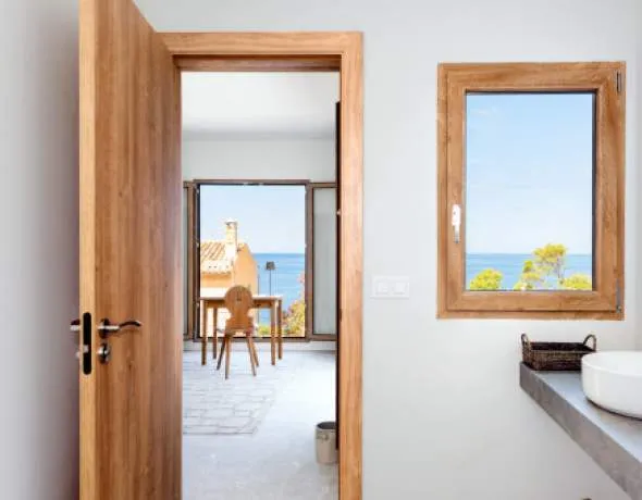 Vom Wohnzimmer aus führt eine Treppe in den ersten Stock, wo sich 2 weitere Schlafzimmer mit ihren stilvollen Badezimmern befinden, en suite und mit schöner Aussicht. Das Hauptschlafzimmer führt auf die Terrasse mit atemberaubendem Blick auf das Meer und die Berge.