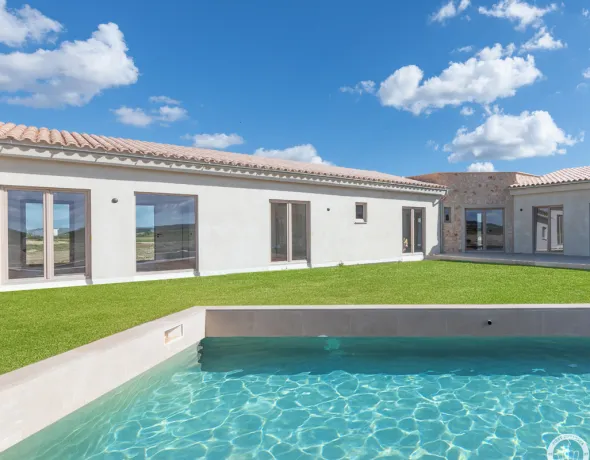 Im Inneren erwartet Sie ein durchdachtes Raumkonzept mit großzügigen, lichtdurchfluteten Bereichen. Der offene Wohn- und Essbereich bildet das Herzstück des Hauses und beeindruckt durch große Fensterfronten, die nicht nur viel Tageslicht hereinlassen, sondern auch einen fließenden Übergang in den Außenbereich schaffen. Über elegante Schiebeelemente gelangen Sie direkt auf die Terrassenlandschaft und zum Salzwasserpool – ein perfekter Ort, um das mediterrane Lebensgefühl in vollen Zügen zu genießen.