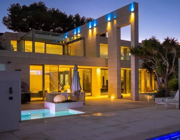 Diese futuristisch angehauchte Villa mit einer konstruierten Fläche von 880 m2 wurde 2013 auf einem Grundstück von 1.980 m2 in Sol de Mallorca gebaut. Die Immobilie verfügt über einen direkten Zugang zum Strand und hat von der Terrasse seitlichen Meerblick. Das Haus verfügt über 5 Doppelschlafzimmer, 7 Bäder, einige von ihnen en suite, voll ausgestattete Küche (plus Arbeitsküche) mit anschliessendem Essbereich und ein sich über 2 Etagen erstreckendes geräumiges Wohnzimmer mit Kamin. Desweiteren können sich die zukünftigen Besitzer in der Sauna, dem Whirlpool, dem Outdoor-Swimmingpool, oder dem Dampfbad auf gemütliche Tage freuen. Der große, sehr private, Garten mit Outdoor-Kitchen und grosser Terrasse bietet genug Möglichkeiten, um diese herrliche Immobilie in vollen Zügen zu geniessen.