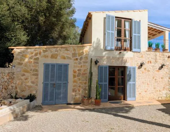 Die obere Etage beherbergt ein separates Schlafzimmer mit schönen Holzbalken, eigenem Badezimmer mit begehbarer Dusche und als besonderes Highlight eine riesige private Terrasse, die atemberaubende Ausblicke auf Santanyí und die umliegende Natur bietet.