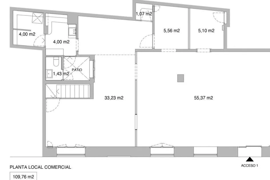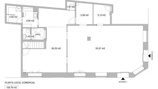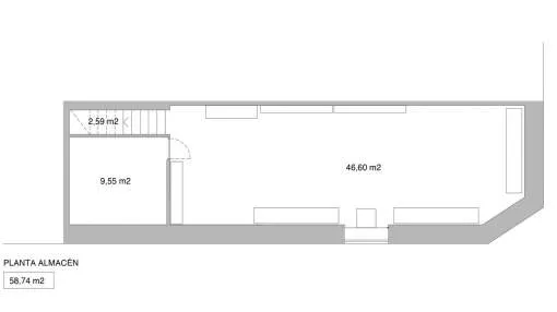 Gewerbeimmobilie mit 168,5 m² (109,76 m² Hauptfläche + 58,74 m² Keller) in Llucmajor, gelegen an einer Ecke neben der Plaza Espanya, mit einer stark frequentierten Fußgängerstraße und einer Seitenstraße für Fahrzeugverkehr, mit Eingängen von beiden Straßen.