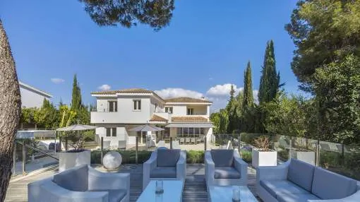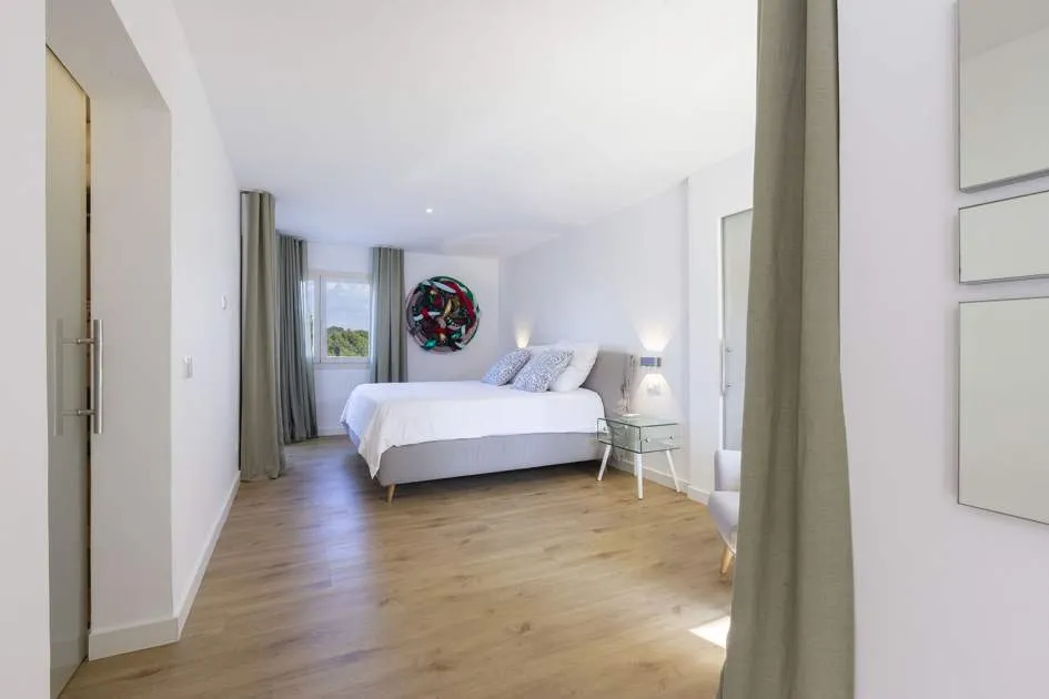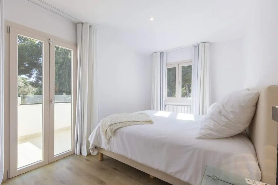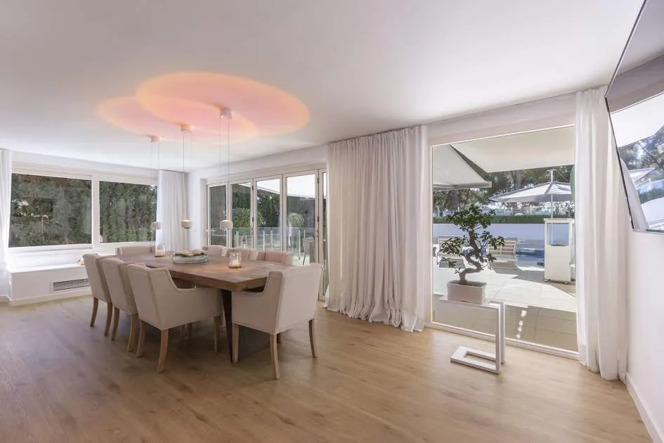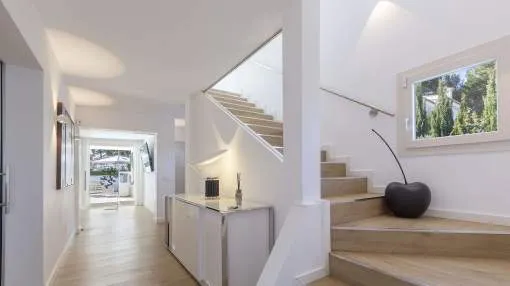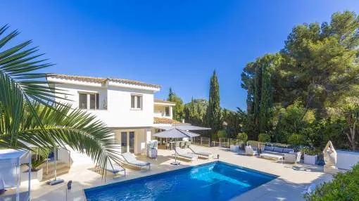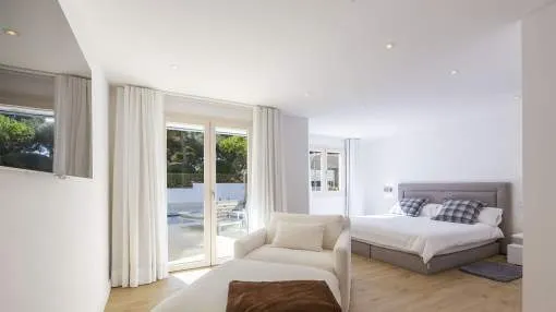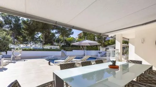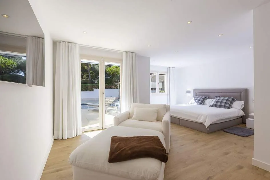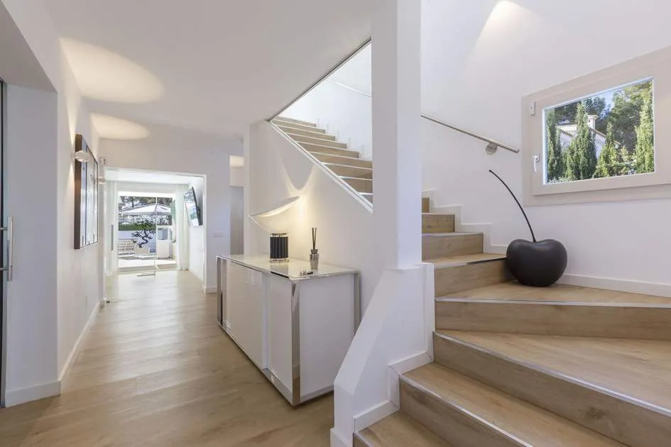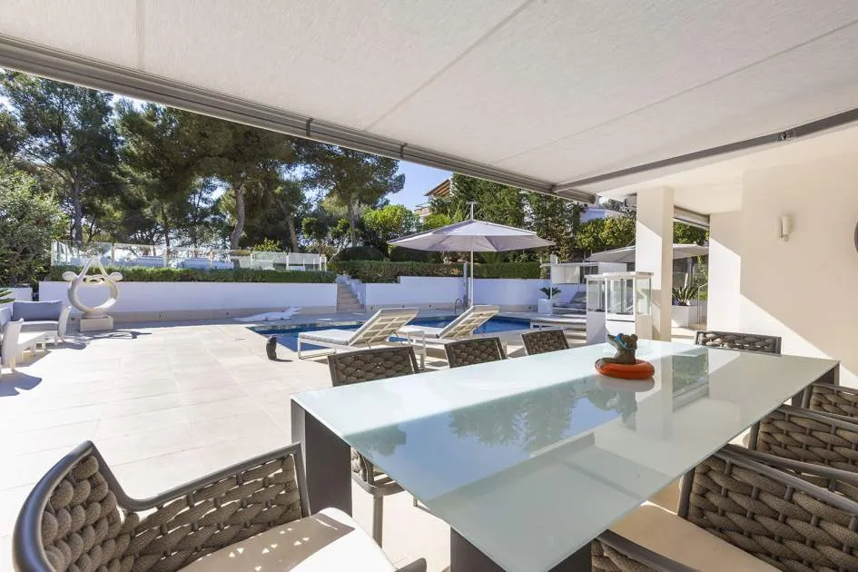 Die in 2018 modernisierte Villa liegt in einer ruhigen, exklusiven Wohnlage nur einen Katzensprung von einem kleinen Sandstrand entfernt. Der Club Náutico und das Zentrum von Santa Ponsa mit einer umfangreichen Infrastruktur wie auch die Golfplätze der Region sind auf kurzem Weg erreichbar. Das Haus erstreckt sich über drei Etagen. Auf der Eingangsebene im 1. Stock befindet sich der große, sehr helle Wohn-/Essbereich mit offener Küche sowie ein Schlafzimmer mit Bad und eine Gästetoilette. Hier hat man Zugang zu einer überdachten Terrasse (Bodenheizung) und zum Pool-Bereich mit einer gemütlichen Lounge und viel Privatsphäre. In der obersten Etage gibt es drei Schlafzimmer mit en suite Bädern und eine Terrasse mit Panoramablick. Darüber hinaus stehen auf Straßenniveau eine große Garage, ein Hauswirtschaftsraum und ein Technikraum zur Verfügung.
