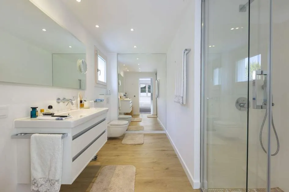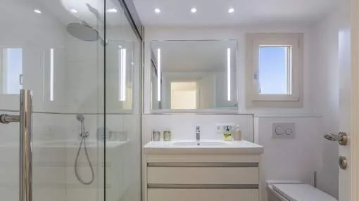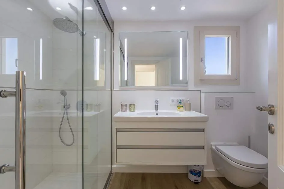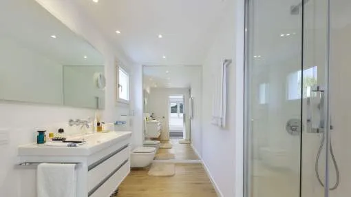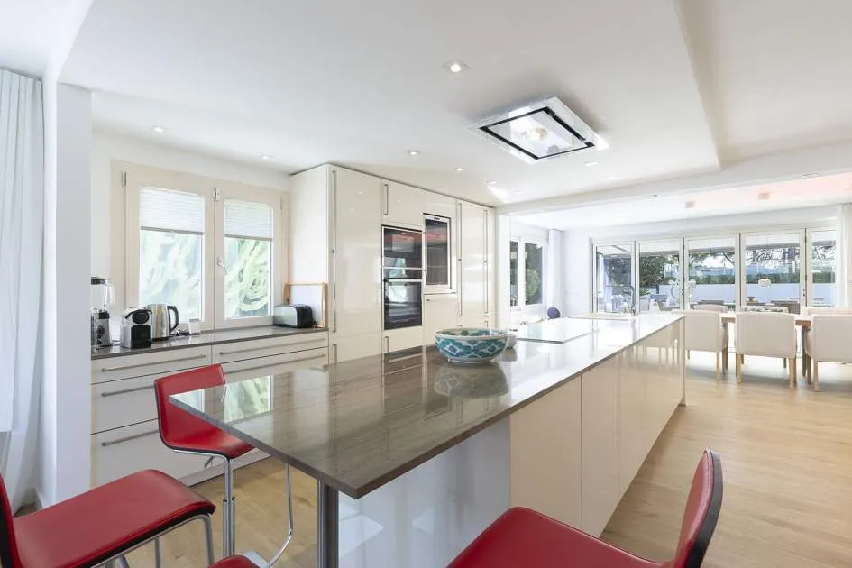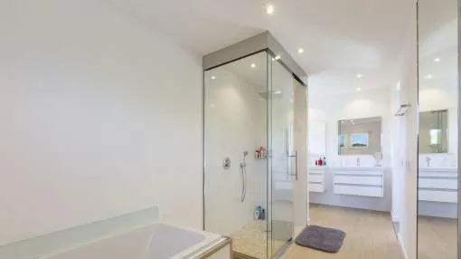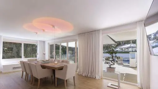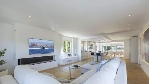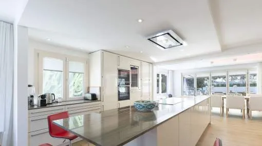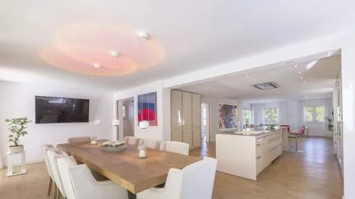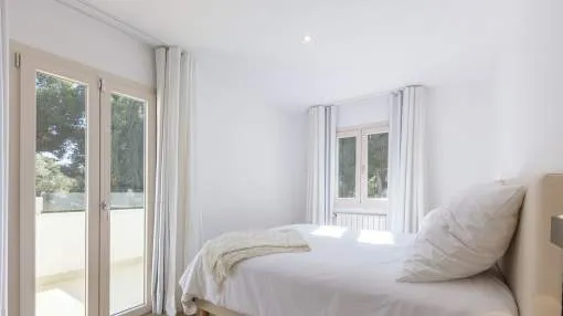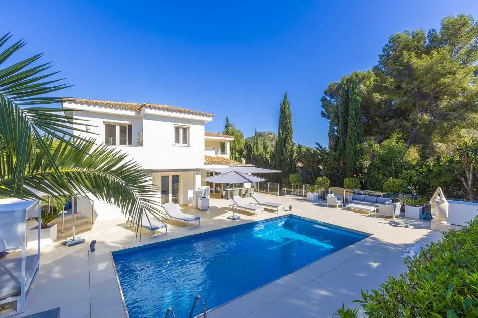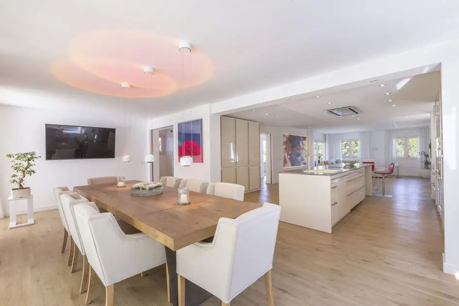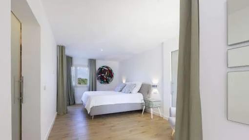 Die in 2018 modernisierte Villa liegt in einer ruhigen, exklusiven Wohnlage nur einen Katzensprung von einem kleinen Sandstrand entfernt. Der Club Náutico und das Zentrum von Santa Ponsa mit einer umfangreichen Infrastruktur wie auch die Golfplätze der Region sind auf kurzem Weg erreichbar. Das Haus erstreckt sich über drei Etagen. Auf der Eingangsebene im 1. Stock befindet sich der große, sehr helle Wohn-/Essbereich mit offener Küche sowie ein Schlafzimmer mit Bad und eine Gästetoilette. Hier hat man Zugang zu einer überdachten Terrasse (Bodenheizung) und zum Pool-Bereich mit einer gemütlichen Lounge und viel Privatsphäre. In der obersten Etage gibt es drei Schlafzimmer mit en suite Bädern und eine Terrasse mit Panoramablick. Darüber hinaus stehen auf Straßenniveau eine große Garage, ein Hauswirtschaftsraum und ein Technikraum zur Verfügung.