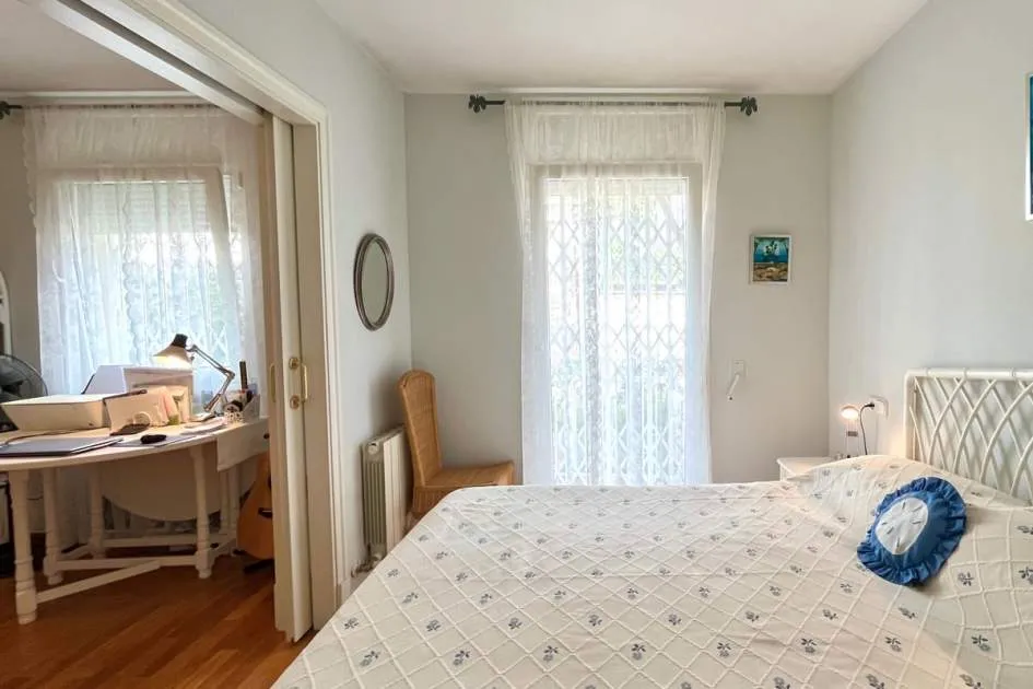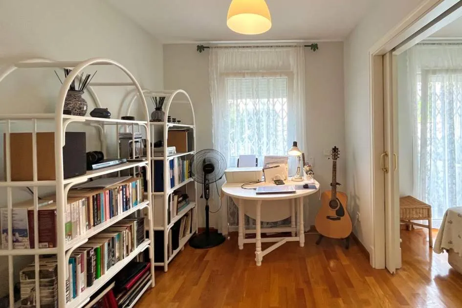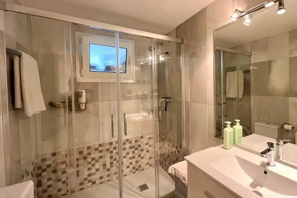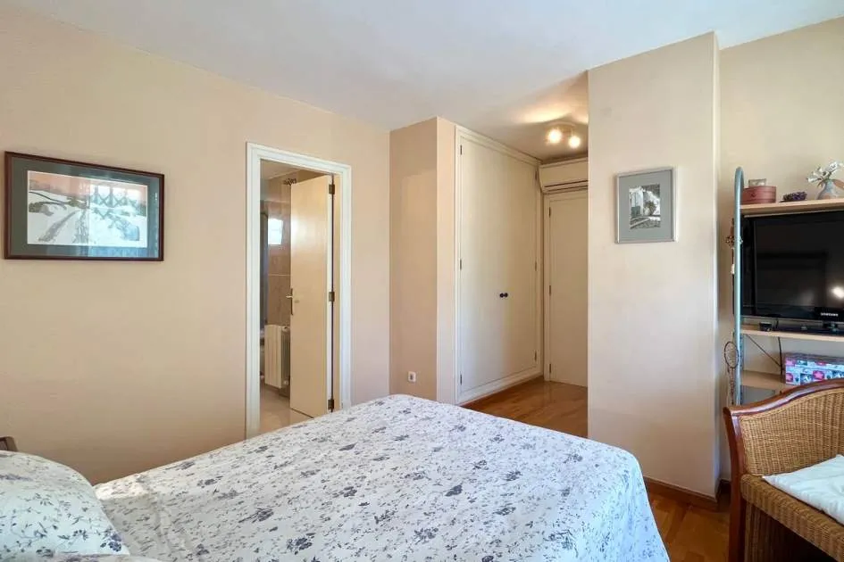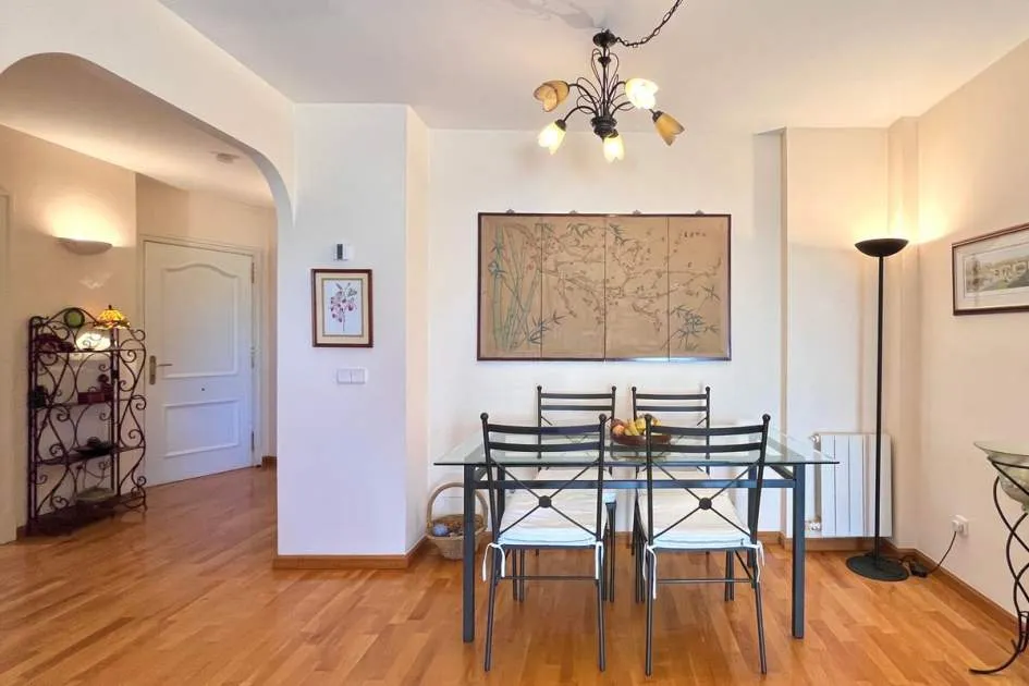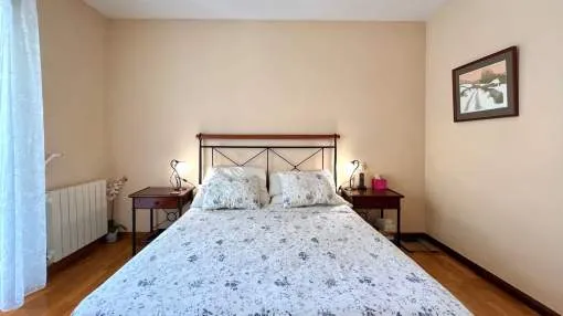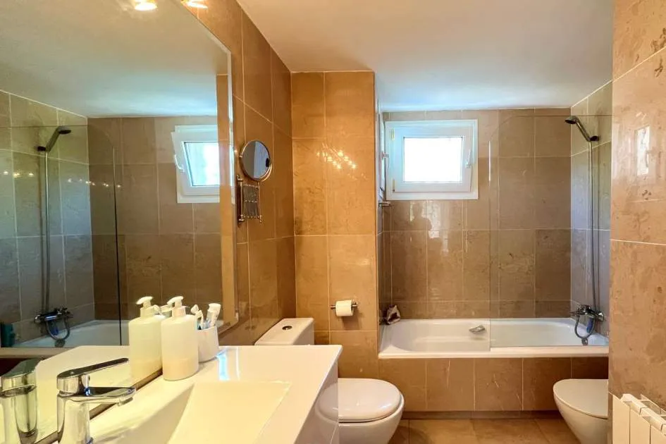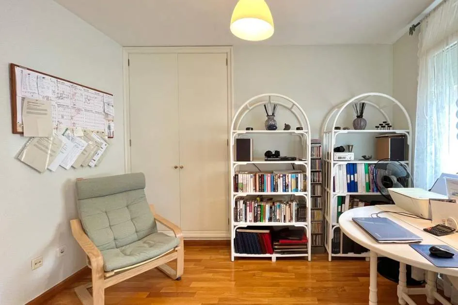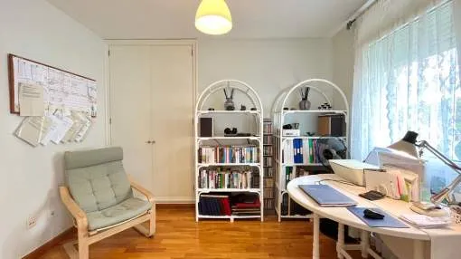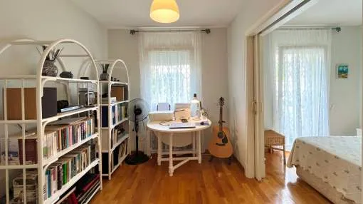 Entlang des Flurs befinden sich drei Schlafzimmer und zwei Badezimmer: das Hauptschlafzimmer mit eigenem Bad en suite und Zugang zur Terrasse sowie zwei weitere Schlafzimmer, die durch eine Tür miteinander verbunden sind. Eines davon wird derzeit als Büro genutzt, kann jedoch getrennt werden, da beide unabhängigen Zugang vom Flur haben, wo sich das zweite Bad befindet.