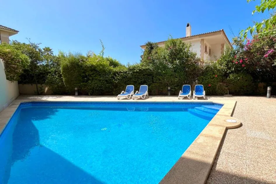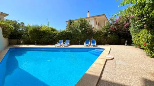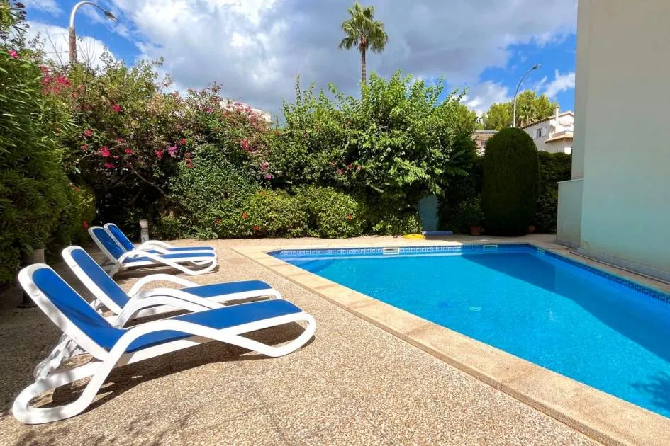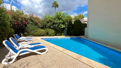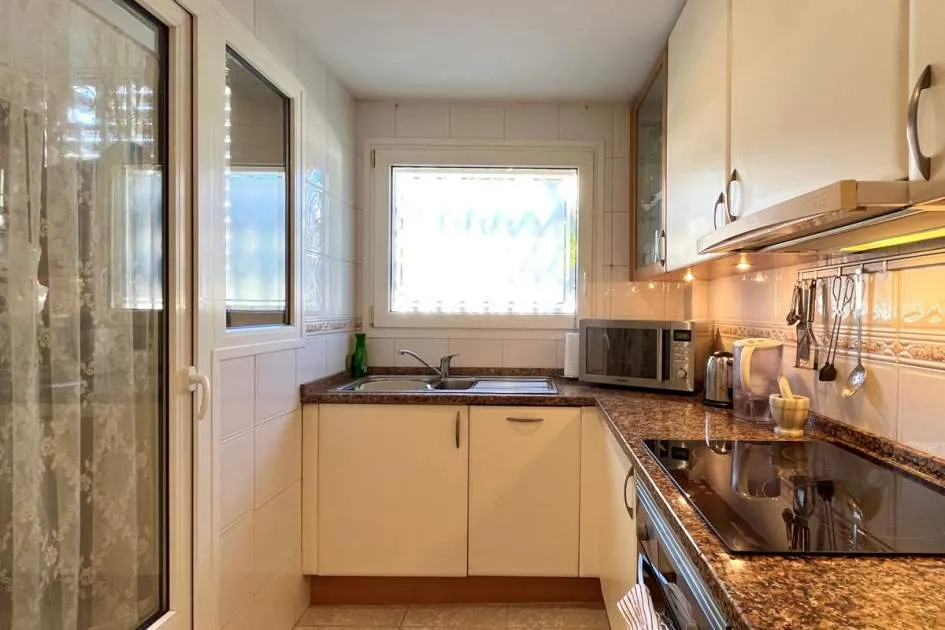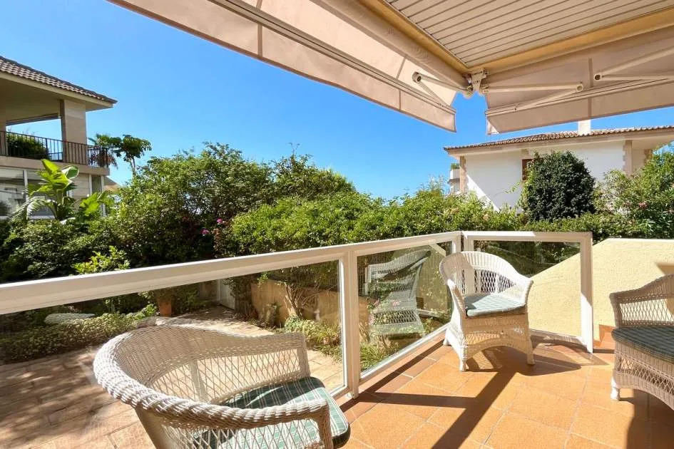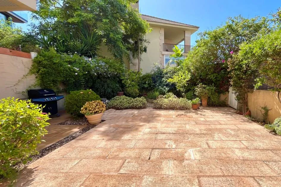 Links vom Eingang befindet sich das Wohn-Esszimmer mit Zugang zur Terrasse. Von hier führen Treppen hinunter zum wunderschönen privaten Garten von ca. 75 m². Eine Tür verbindet direkt mit dem Gemeinschaftspool, sodass Sie ein Bad genießen und bequem zurück nach Hause gehen können.