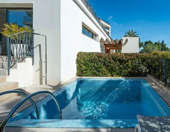 Die großzügige Terrasse mit privatem Pool und liebevoll angelegtem Garten schafft eine idyllische Oase für entspannte Stunden und stilvolle Abende unter der mallorquinischen Sonne. Traditionelle Natursteinelemente fügen sich harmonisch in das zeitgenössische Design ein und verleihen dem Ambiente eine besondere Authentizität.