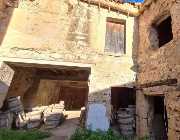 Das angrenzende Gebäude ist ein traditionelles Wohnhaus mit klassischer Raumaufteilung: Wohnzimmer, ehemalige Küche, Badezimmer, Schlafzimmer sowie eine Innenhof-Terrasse mit direkter Verbindung zur Kellerei.