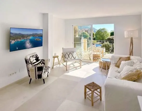 In begehrter Lage von Puerto de Andratx präsentiert sich dieses aufwendig sanierte Apartment als ideale Verbindung aus modernem Wohnkomfort und mediterranem Lebensgefühl. Die Wohnung befindet sich in der ersten Etage einer gepflegten Wohnanlage mit nur 21 Einheiten, die sich auf fünf Gebäude verteilen, und überzeugt durch ihre ruhige, zugleich aber zentrale Lage. Sowohl die elegante Hafenpromenade als auch der renommierte Club de Vela Puerto de Andratx sind in nur etwa zehn Gehminuten bequem erreichbar.
