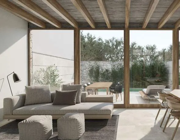 Im Erdgeschoss befindet sich das Master-Schlafzimmer mit Bad en suite, eine offene Küche mit Wohn- und Essbereich sowie der direkte Zugang zur Terrasse und zum privaten Poolbereich.