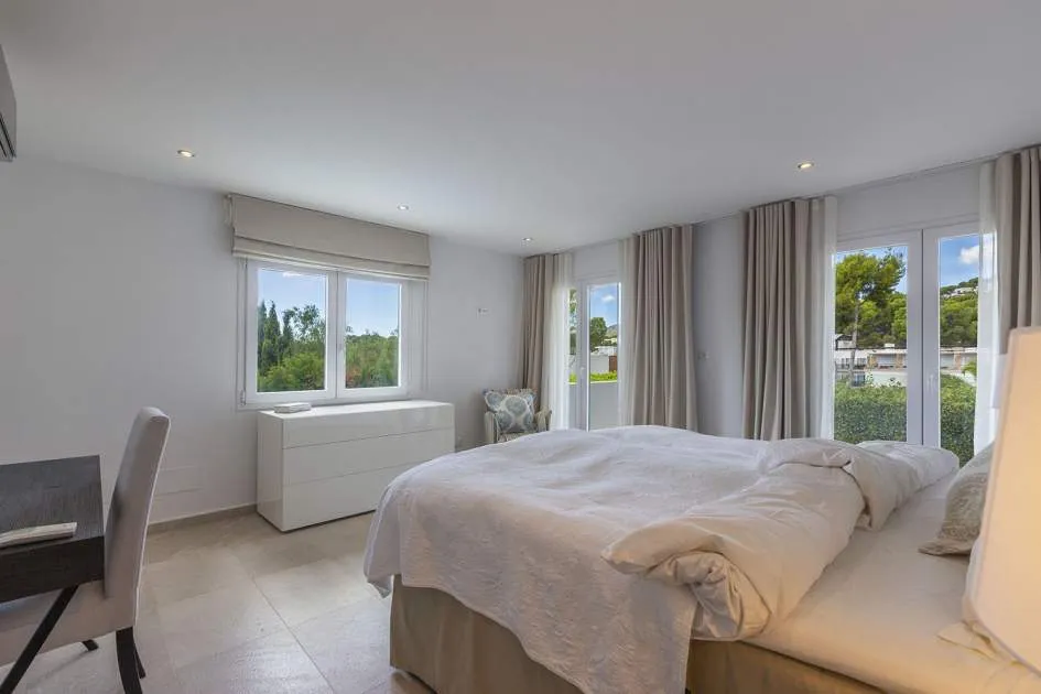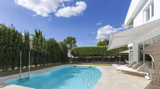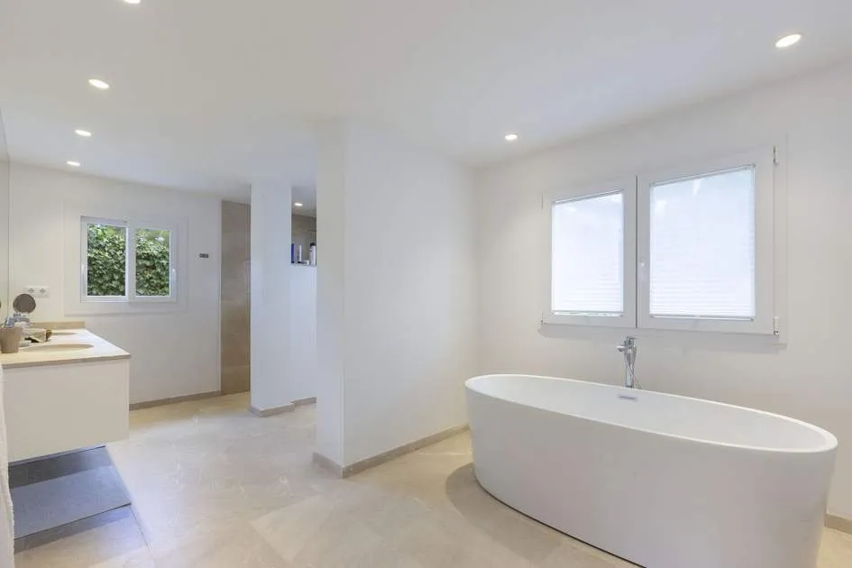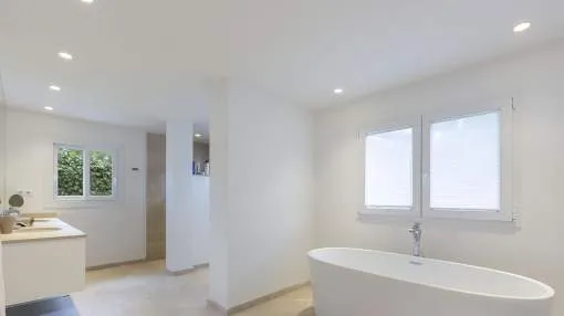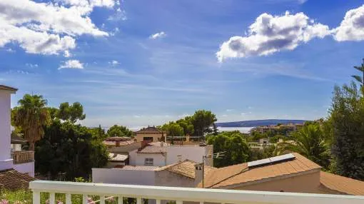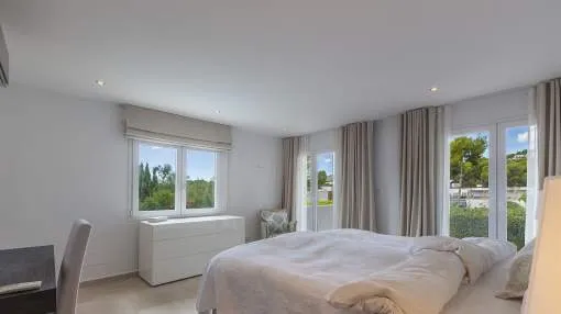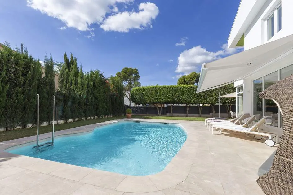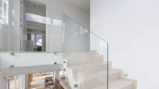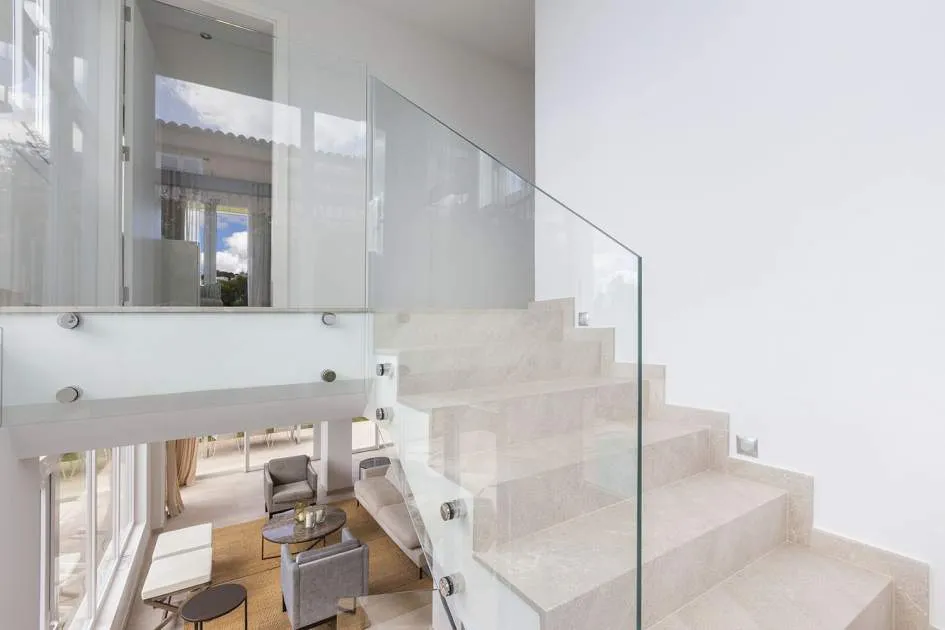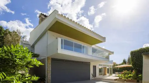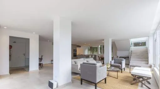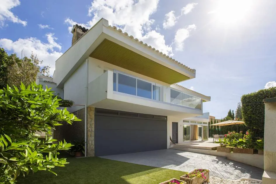 Diese südwestorientierte, komplett sanierte Villa befindet sich in einer der exklusivsten Wohnlagen des Südwestens. Nahe Palma und in unmittelbarer Nachbarschaft des königlichen Golfplatzes und des Nobelhafens Puerto Portals bietet die hervorragende und strandnahe Lage sehr viel Ruhe, verfügt aber über eine perfekte Infrastruktur. Die Wohnfläche auf der Eingangsebene im Erdgeschoss teilt sich auf in ein lichtes Wohn-/Essbereich mit offener Küche, an den sich die Poolterrasse anschließt, ein Wirtschaftsraum sowie ein Gäste-WC und eine geräumige Doppelgarage. Die obere Etage verfügt über das geräumige Masterschlafzimmer mit Kamin, Bad, Ankleide sowie drei weitere Schlafzimmer und ein Bad. Hinzu kommt eine einladende überdachte Terrasse mit schöner Aussicht. Des Weiteren steht eine Dachterrasse mit Teil-Meerblick und ein Carport zur Verfügung.