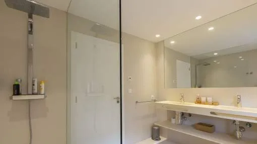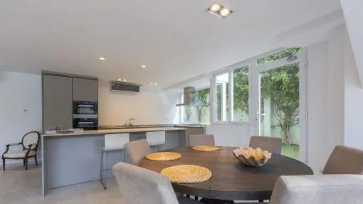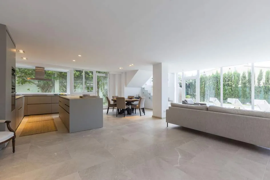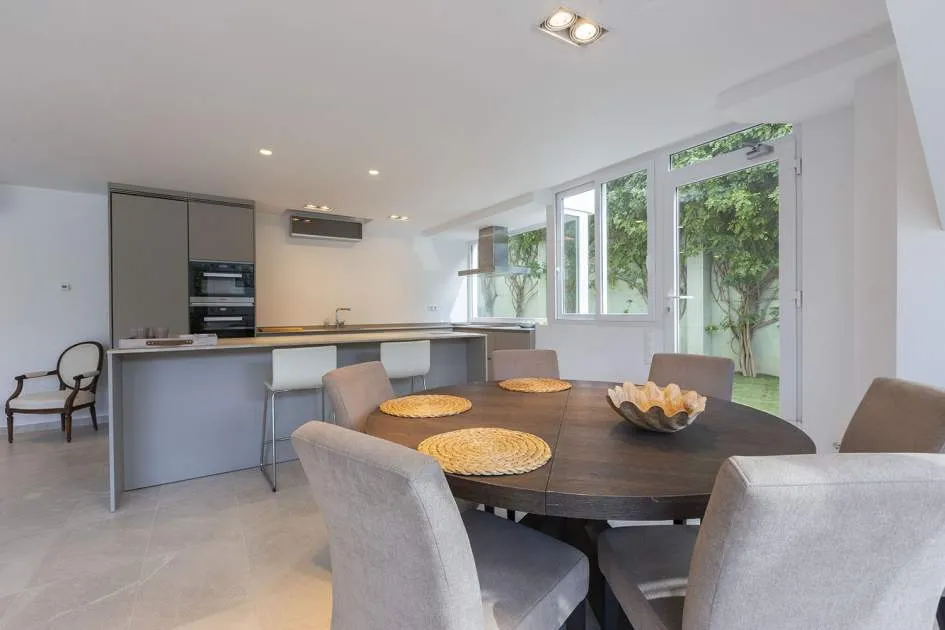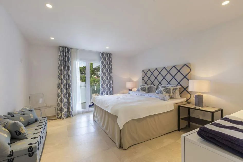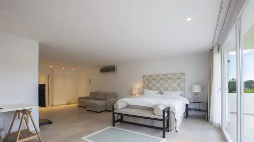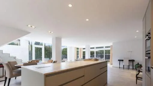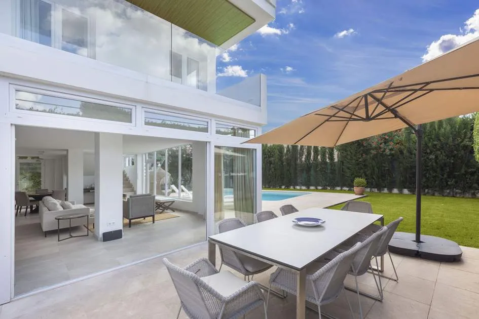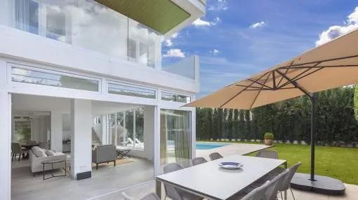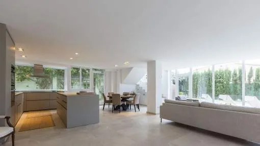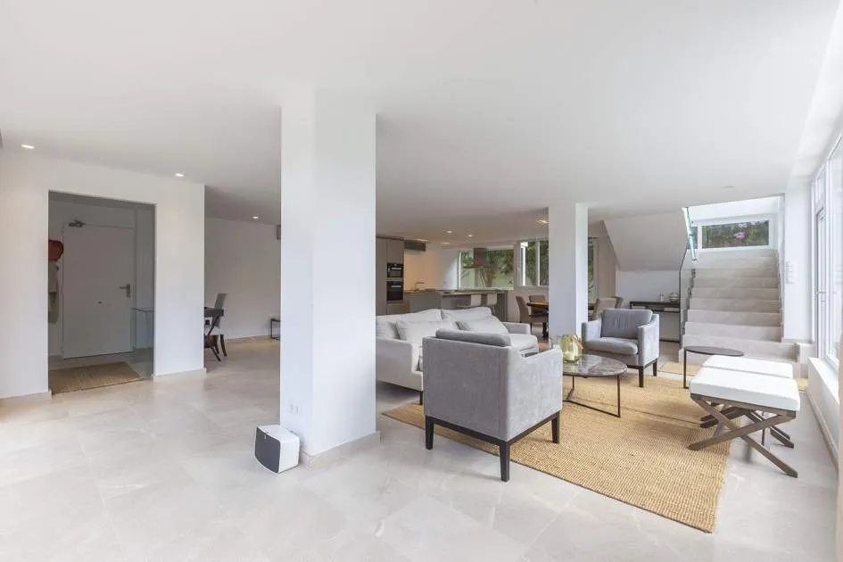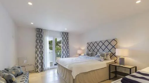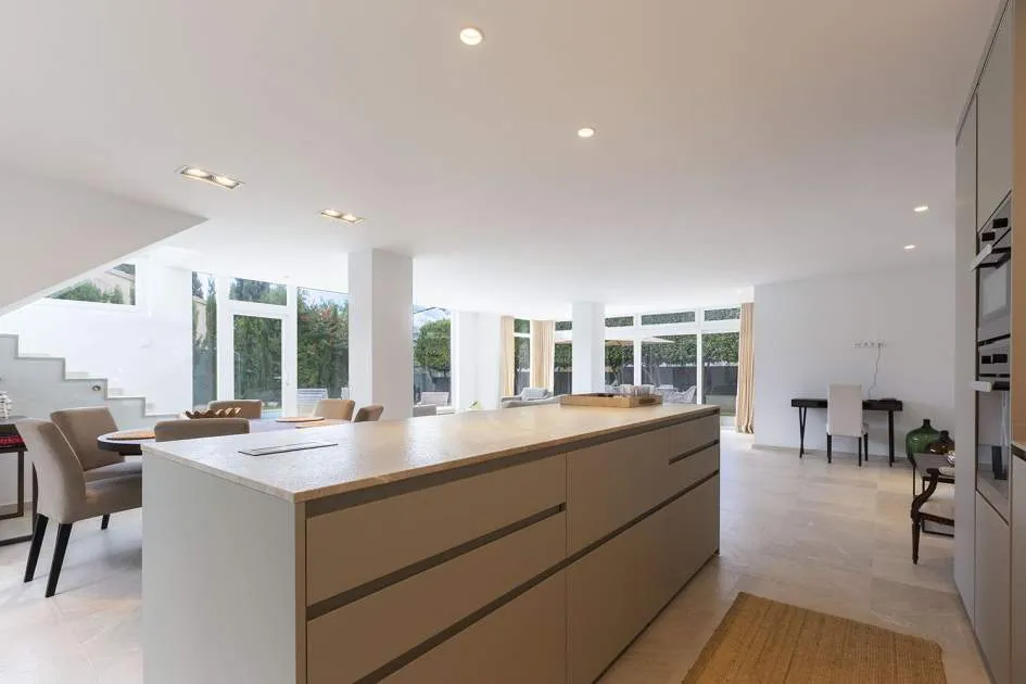 Diese südwestorientierte, komplett sanierte Villa befindet sich in einer der exklusivsten Wohnlagen des Südwestens. Nahe Palma und in unmittelbarer Nachbarschaft des königlichen Golfplatzes und des Nobelhafens Puerto Portals bietet die hervorragende und strandnahe Lage sehr viel Ruhe, verfügt aber über eine perfekte Infrastruktur. Die Wohnfläche auf der Eingangsebene im Erdgeschoss teilt sich auf in ein lichtes Wohn-/Essbereich mit offener Küche, an den sich die Poolterrasse anschließt, ein Wirtschaftsraum sowie ein Gäste-WC und eine geräumige Doppelgarage. Die obere Etage verfügt über das geräumige Masterschlafzimmer mit Kamin, Bad, Ankleide sowie drei weitere Schlafzimmer und ein Bad. Hinzu kommt eine einladende überdachte Terrasse mit schöner Aussicht. Des Weiteren steht eine Dachterrasse mit Teil-Meerblick und ein Carport zur Verfügung.
