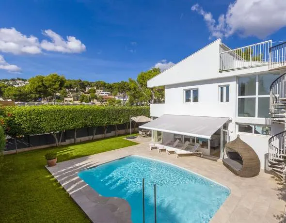 Diese südwestorientierte, komplett sanierte Villa befindet sich in einer der exklusivsten Wohnlagen des Südwestens. Nahe Palma und in unmittelbarer Nachbarschaft des königlichen Golfplatzes und des Nobelhafens Puerto Portals bietet die hervorragende und strandnahe Lage sehr viel Ruhe, verfügt aber über eine perfekte Infrastruktur. Die Wohnfläche auf der Eingangsebene im Erdgeschoss teilt sich auf in ein lichtes Wohn-/Essbereich mit offener Küche, an den sich die Poolterrasse anschließt, ein Wirtschaftsraum sowie ein Gäste-WC und eine geräumige Doppelgarage. Die obere Etage verfügt über das geräumige Masterschlafzimmer mit Kamin, Bad, Ankleide sowie drei weitere Schlafzimmer und ein Bad. Hinzu kommt eine einladende überdachte Terrasse mit schöner Aussicht. Des Weiteren steht eine Dachterrasse mit Teil-Meerblick und ein Carport zur Verfügung.