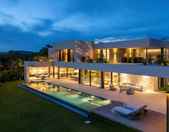 Diese beeindruckende Villa verbindet moderne Architektur mit einem warmen, mediterranen Charakter. Entworfen von einem renommierten Architekten Mallorcas, prägen klare Linien, Naturstein, Holzelemente und begrünte Fassaden das Erscheinungsbild und schaffen eine harmonische Einbindung in die Umgebung.