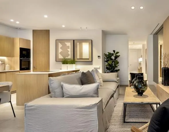 Die Wohnung verfügt über zwei Schlafzimmer und zwei stilvolle Badezimmer, darunter ein modernes En-Suite-Bad. Die Master-Suite bietet zudem einen begehbaren Kleiderschrank. Der offene Wohn-, Ess- und Küchenbereich bildet das Herzstück der Wohnung, ergänzt durch einen separaten Hauswirtschaftsraum.