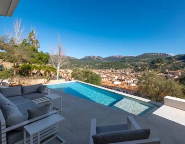 Der Infinity-Pool liegt direkt vor dem Wohnbereich und ist zur Aussicht ausgerichtet. Von hier aus genießt man einen weiten, unverbaubaren Blick über Esporles und die umliegenden Berge. Terrassenflächen und Gartenbereiche schaffen private Rückzugsorte in ruhiger Lage.