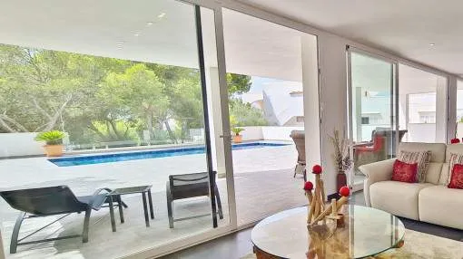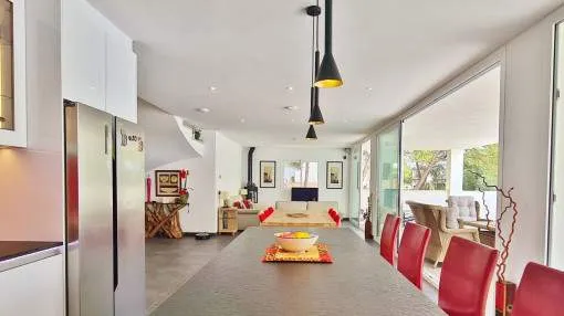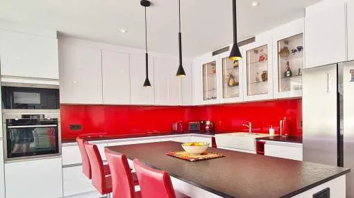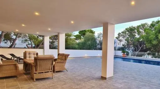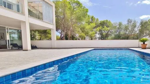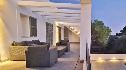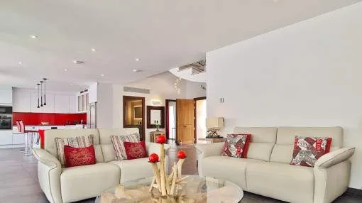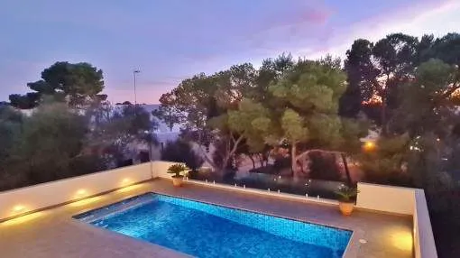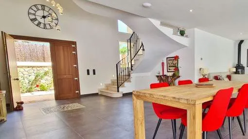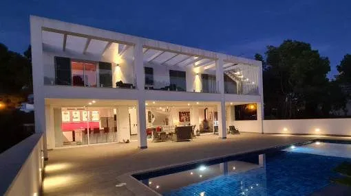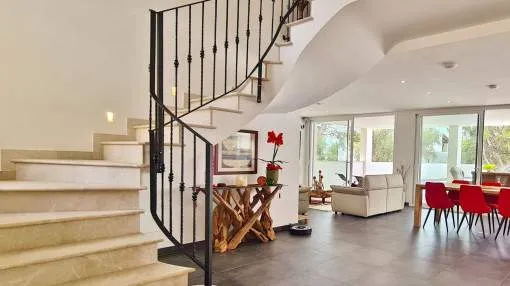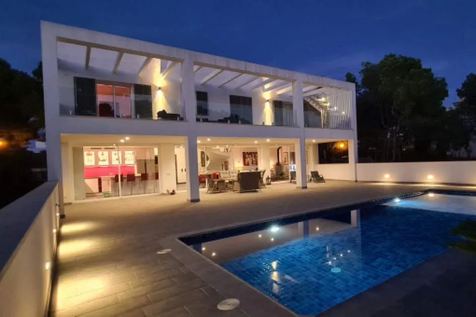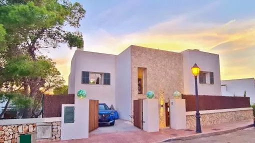 Details: This elegant luxury villa, built in 2021, impresses with its excellent location, modern design, and well-thought-out layout. Just 200 meters from the marina and only a 5-minute walk to the nearest beach, it offers the perfect setting for both permanent living and exclusive holiday stays. The property features approximately 210 m² of living space on a plot of around 555 m², with spacious and light-filled interiors. The heart of the home is the open-plan living area, seamlessly combining the living room, dining area, and a modern kitchen—ideal for everyday living and entertaining. The villa offers 4 bedrooms, including a stylish master bedroom with en-suite bathroom, as well as two additional fully equipped bathrooms. High-quality materials and contemporary design create a sophisticated yet comfortable atmosphere. Highlights include a spacious rooftop terrace with multiple uses, a private pool, and a well-designed lighting concept both indoors and outdoors. For maximum comfort, the property is equipped with air conditioning, underfloor heating, a smart home system, and an alarm system. This villa is ideal for owner-occupiers—whether as a luxury holiday home, for boat owners due to its proximity to the marina, or as a permanent residence in an exclusive setting. A property that perfectly combines modern living, prime location, and lifestyle quality. Returns from holiday lettings: For initial orientation you can use the “Porta Holiday Returns Calculator” without obligation to calculate your potential returns from holiday letting. NB: Due to the current legal situation it is possible that in certain municipalities renting restrictions may apply, or new touristic licences may not be granted. Your Porta Mallorquina real estate consultant will be pleased to advise you whether the property you have chosen is affected. Go to Returns Calculator. Location & surrounding area: Cala d’Or, the golden bay, is located in the southeast of Mallorca, right by the sea. The white houses of this resort specialized on the needs of international guests are outstanding from the slightly hilly and green backcountry. The legendary marina attracts lovers of recreational crafts from all over the world. Right by the marina, there is a beautiful boulevard with a large selection of good restaurants and bars, ideal for strolling. For those wanting to be active, the beautiful golf course of Vall d’Or, several small bays as Cala Esmeralda and a versatile range of water sports possibilities offer numerous alternatives for the best time of the year.