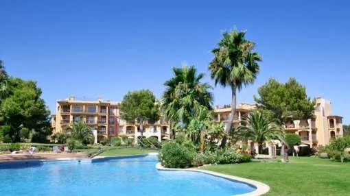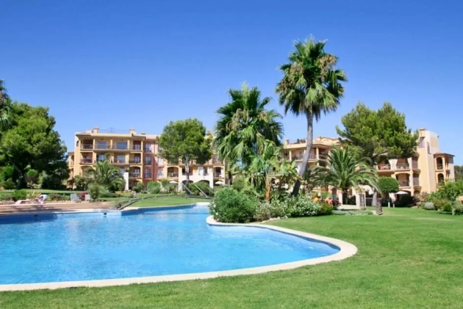 Elegantes Apartment in erstklassiger Wohnanlage neben den Golfplätzen in Nova Santa Ponsa, Südwesten Mallorcas. Die Wohnanlage rechnet mit nur 42 Apartments in 3 Gebäuden, was es erlaubt, sie als Oase des Friedens und der Ruhe zu bezeichnen. Die Anwohner und Ihre Gäste profitieren vom eingegrenzten weitläufigen Gelände, welches einen Swimmingpool im Lagunen-Stil umgeben von wundervollen tropischen Gärten bietet.