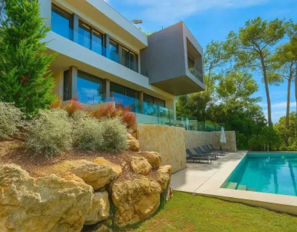 Die rund 588 m² Wohn-/Nutzfläche verteilen sich auf drei Ebenen und sechs großzügige Doppelschlafzimmer, jeweils mit Bad en suite. Der offene Wohn-/Essbereich mit raumhohen Fenstern führt auf großflächige, teils überdachte Terrassen – ideal für lange Abende im Freien. Die Designküche ist mit hochwertigen italienischen Marken ausgestattet und fügt sich nahtlos in das klare Interieur mit Natursteinböden ein. Private Rückzugsorte wie ein Heimkino sowie ein Fitnessraum mit Dampfbad und eigenem Bad ergänzen das Angebot; ein Aufzug verbindet alle Ebenen komfortabel.