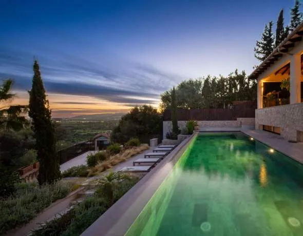 Im Außenbereich fügt sich ein beheizter Infinity-Pool nahtlos in den Horizont ein, umgeben von Stein-Terrassen und einem mediterranen Garten mit jahrhundertealten Oliven- und Palmenbäumen. Die Terrassen bieten ideale Bereiche zum Entspannen, Essen oder Genießen der Panoramablicke und vervollständigen ein Zuhause, das das Beste des mallorquinischen Lebensstils verkörpert.