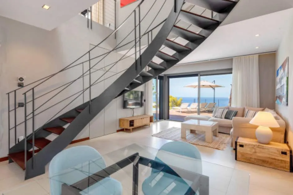Auf der oberen Wohnebene empfängt Sie ein lichtdurchfluteter Wohn- und Essbereich mit Holzkamin und dahinterliegenden Home-Office. Die angrenzenden, weitläufigen Terrassen laden zum Innehalten ein: vorne mit atemberaubendem Meerblick, hinten mit einer großzügigen, windgeschützten Rückzugsoase für gesellige Abende oder entspannte Stunden im Schatten. Ein Schlafzimmer mit Badezimmer en suite sowie eine Gästetoilette runden diese Ebene ab.