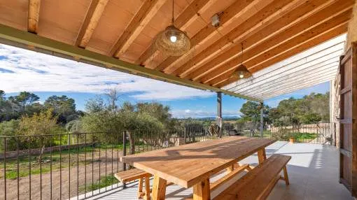 Objektbeschreibung: Diese ebenerdige Natursteinfinca wurde im Sommer 2018 fertiggestellt und befindet sich lediglich 4 km von Can Picafort entfernt. In voller Südausrichtung und umgeben von einem Olivenhain, bietet diese Liegenschaft auf knapp 15.000 qm absolute Privatsphäre. Die bebaute Wohnfläche von ca. 140 qm umfasst den Eingangsbereich, 3 Doppelschlafzimmer mit Einbauschränken, ein Duschbadezimmer, das Hauptschlafzimmer mit Badezimmer en Suite, ein separates Duschbadezimmer für die Gäste sowie einen weitläufigen Wohn-/Ess-/Küchenbereich. Die Architektur ist traditionell-mediterran. Besonders hervorzuheben sind die hohen Decken mit Holzbalken, die Natursteinfassade sowie die zahlreichen Ausgänge - von allen Zimmern - in den Außenbereich. Zentraler Punkt des Außenbereiches ist der 41qm große Pool. Vom Wohnzimmer aus ist die überdachte Poolterrasse sowie der Garten zu erreichen. Zur Ausstattung gehören Fliesenböden, doppelt verglaste PVC-Fenster und Türen, Einbauküche, Klimaanlage in allen Räumen und eine komplette Möblierung. Das Grundstück verfügt über Strom und eigenes Wasser. Rendite aus Ferienvermietung: Mit dem „Porta Holiday Renditerechner“ können Sie zur ersten Orientierung unverbindlich Ihre potenziellen Einnahmen aus einer möglichen Ferienvermietung berechnen. Hinweis: Aufgrund der aktuellen Gesetzeslage kann es in bestimmten Gemeinden zu einer Beschränkung der Vermietbarkeit kommen bzw. werden keine neuen touristischen Lizenzen mehr vergeben. Ihr Porta Mallorquina Immobilienberater berät Sie gerne, ob die von Ihnen gewählte Immobilie davon betroffen ist. Hier geht’s zum Renditerechner. Lage & Umgebung: Der Norden Mallorcas bietet auch besonders im Inland eine reichhaltige Auswahl an bezaubernden Orten. Da hat es z.B. hübsche kleine, noch typisch Mallorquinische Dörfer wie Campanet, Buger, Muro oder Santa Margalida, welche, jedes für sich, einen eigenen, ursprünglichen Charakter aufweisen und in deren Ortskern man noch das wahre Leben und die ursprüngliche Kultur dieser bezaubernden Mittelmeerinsel, hautnah erleben kann. Und auch dort gibt es allerlei Alternativen zu Pollensa oder Alcudia, wenn man sich nach einem romantischen Stadthaus oder einer ruhig gelegenen Finca in dennoch unmittelbarer Strandnähe umsehen möchte. Besonders Campanet und Búger vereint mit ihrer unmittelbaren Anbindung an die 2006 erstellte Autobahn Palma-Alcudia ein weiterer Vorteil: Man ist von dort aus in ca. 25 Minuten in Palma und bekommt dennoch von der Autobahn nichts mit.