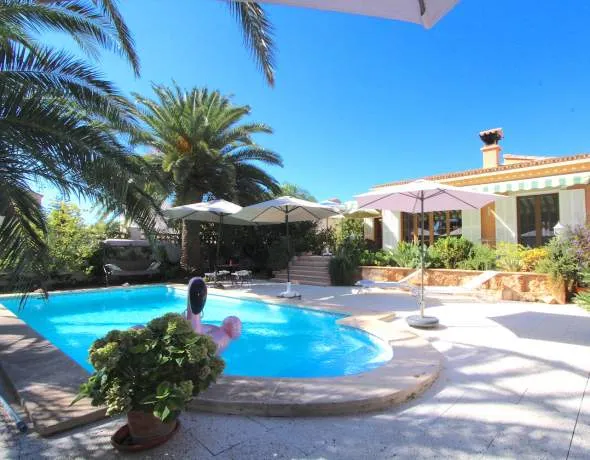 Diese charmante Villa im mediterranen Stil befindet sich in einer der ruhigen Wohnlagen von Badia Blava. Eingebettet in ein Grundstück mit absoluter Privatsphäre entfaltet sich ein liebevoll gestalteter Garten, der mit seiner mediterranen Bepflanzung eine ganz besondere Atmosphäre schafft. Palmen, blühende Pflanzen und sonnendurchflutete Terrassen bilden eine grüne Oase, die zum Verweilen, Genießen und Entspannen einlädt.