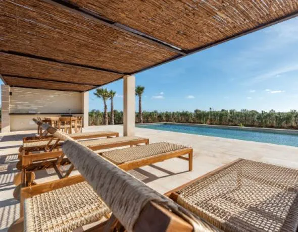 This exclusive newly built finca is located in a privileged setting, just minutes from the stunning turquoise natural beach of Es Trenc, nestled in the Mediterranean countryside between Campos and Sa Rápita.