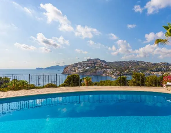 Diese mediterrane Villa in Port Andratx vereint elegantes Design mit einem beeindruckenden Blick auf den Hafen und das offene Meer. Der gepflegte Zustand und die durchdachte Raumaufteilung machen diese Immobilie zu einem besonderen Rückzugsort im Südwesten Mallorcas. Im Untergeschoss befinden sich eine großzügige Doppelgarage, ein Carport sowie ein klimatisierter Weinkeller. Ein separates Gästeapartment mit eigenem Badezimmer bietet Privatsphäre für Besucher. Ergänzt wird diese Ebene durch einen Hauswirtschaftsraum, einen Kellerraum und einen Technikraum. Das Erdgeschoss öffnet sich zum Poolbereich mit Sonnenterrassen und einem überdachten Poolhouse, ausgestattet mit einer vollwertigen Außenküche, ein separater Abstellraum, drei Schlafzimmer mit Bad en Suite bieten komfortable Rückzugsorte. Eines dieser Schlafzimmer ist separat zugänglich. Der offene Wohn- und Essbereich mit Küche, ein Gäste-WC sowie ein zusätzlicher Hauswirtschaftsraum vervollständigen das Raumangebot dieser Etage. Das Obergeschoss beherbergt das Hauptschlafzimmer mit Bad en Suite und Ankleide sowie ein weiteres, direkt angeschlossenes Zimmer, das sich flexibel als Büro, Fitnessbereich oder zusätzliches Schlafzimmer nutzen lässt. Mit mediterranem Charme, gepflegtem Ambiente und spektakulärem Hafenblick bietet diese Villa eine einmalige Wohnqualität in einer der begehrtesten Lagen Mallorcas.